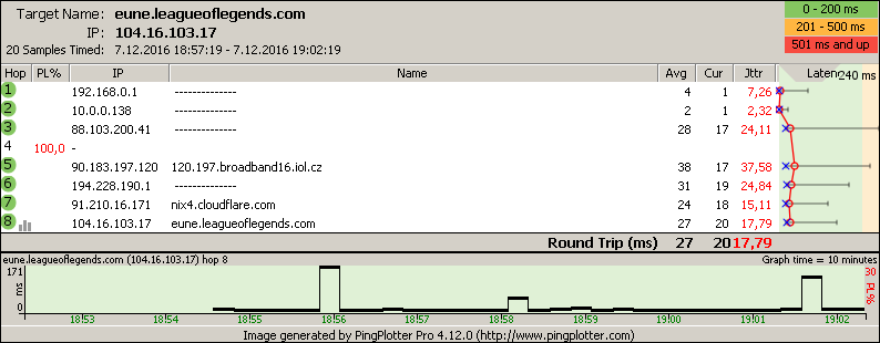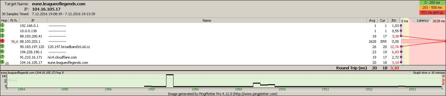 3) Nainstaloval jsem a spustil také ping plotter. Nechal jsem jej monitorovat 5 minut (v prvním případě každých 15 vteřin v druhém každých 10 vteři), zatímco jsem hrál. Nevím nicméně, co ve výsledcích přesně hledat.