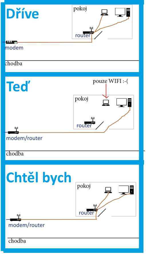 Protože náš starý router měl občas problémy s WiFi, tak jsme ho odpojili a používáme přímo ten od UPC - PC přes kabel, NTB přes Wifi. Já ale potřebuji občas přenést větší data mezi PC a NTB, takže potřebuji připojit drátem i ten NTB. Dříve jsem měl router rovnou v pokoji, takže jsem mohl pohodlně připojit kabelem NTB. Jenže teď, jak máme nový modem/router na chodbě, tak bych musel ten NTB nést na chodbu, abych ho připojil, což je celkem nepohodlné.
