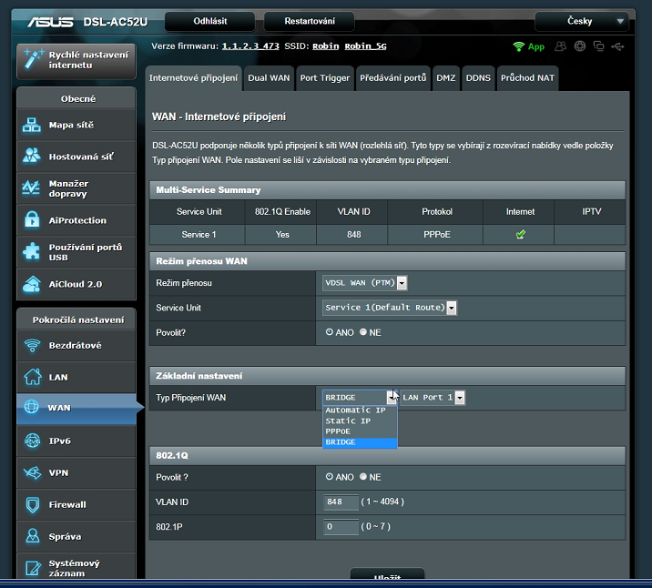 Díky za radu, zkusil jsem nastavit " ethernet " na místo VDSL a funguje to, ale mám dvě záhady. Držel jsem se návodu " router jako switch " a vypnul DHCP. Po tom jsem se už nedostal na Asus a musel resetovat. Nyní mě to funguje se zapnutým, ale dle návodu by být neměl.