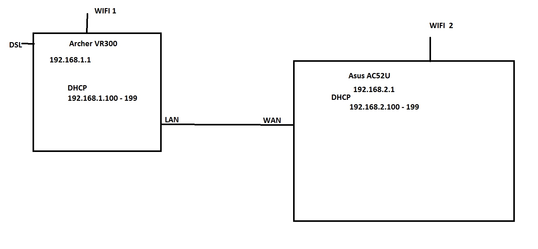 Ne jen ze mas za sebou dva routery ale na asusu mas nastavenou spatnou IP adresu. Pokud by ti mely ty dva routery za sebou fungovat spolu v siti musi byt nastavena IP z rozsahu prvni lan takze 192.168.1.xxx ty mas 192.168.2.1 . Proto se na na asus nemuzes z tp linku pripojit ani z asusu na tp link.