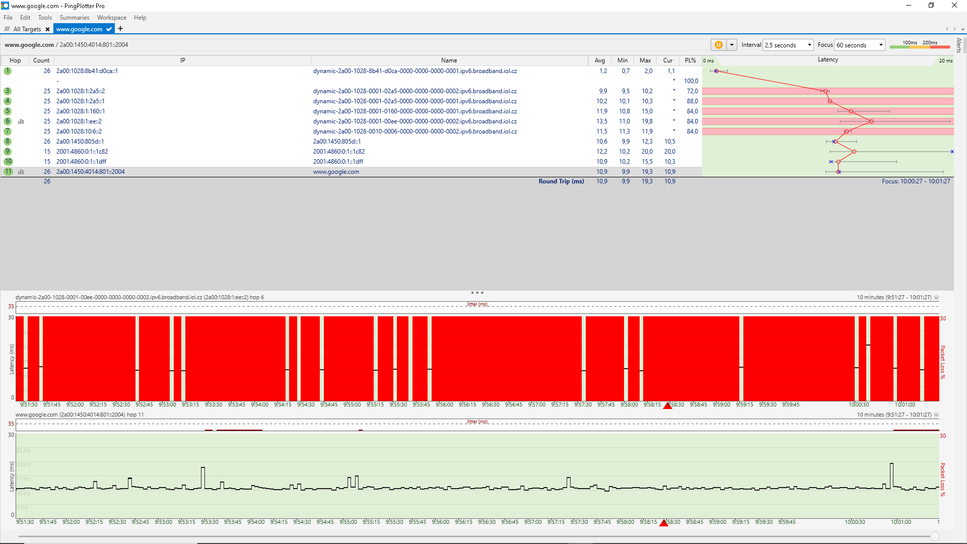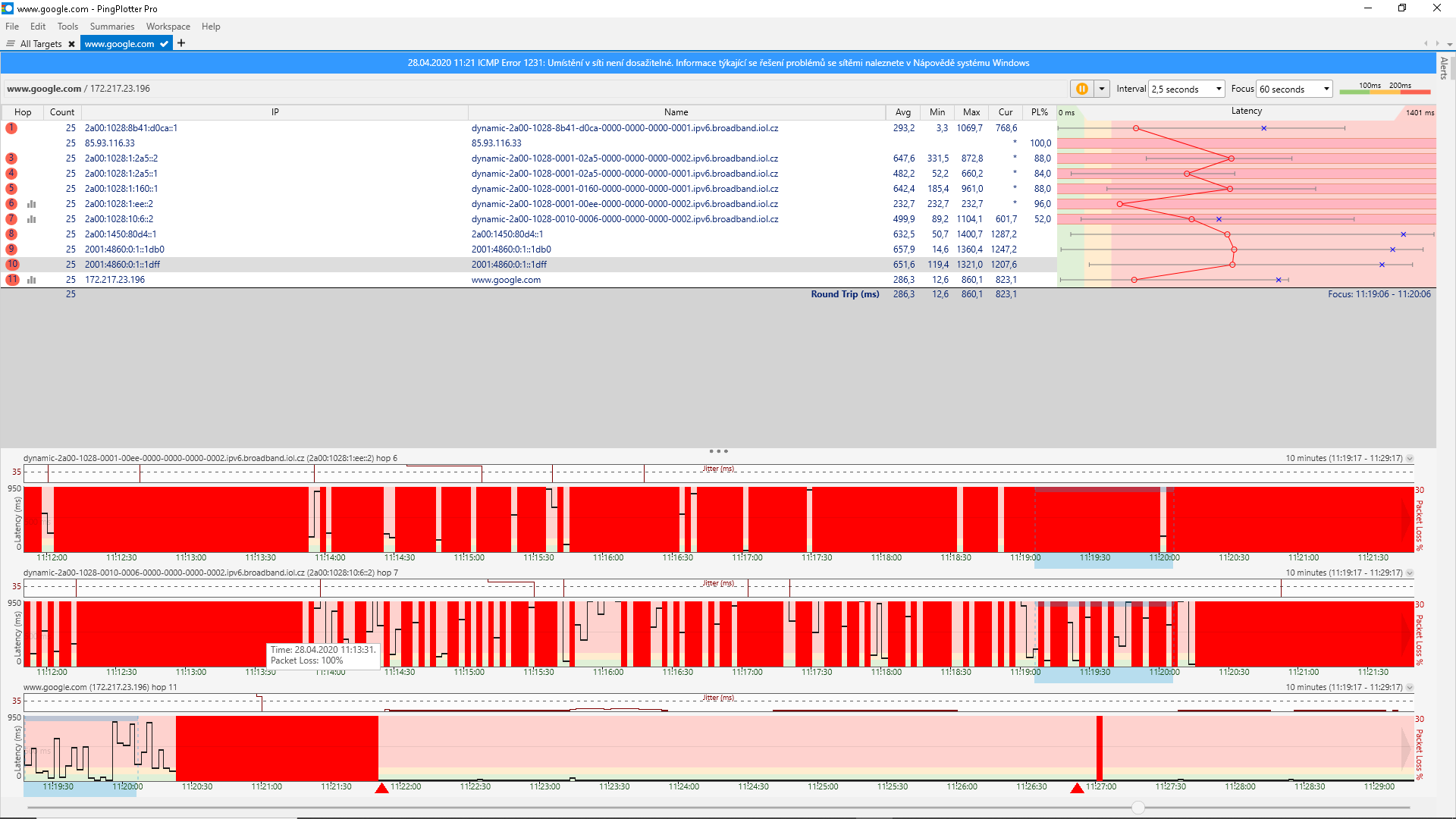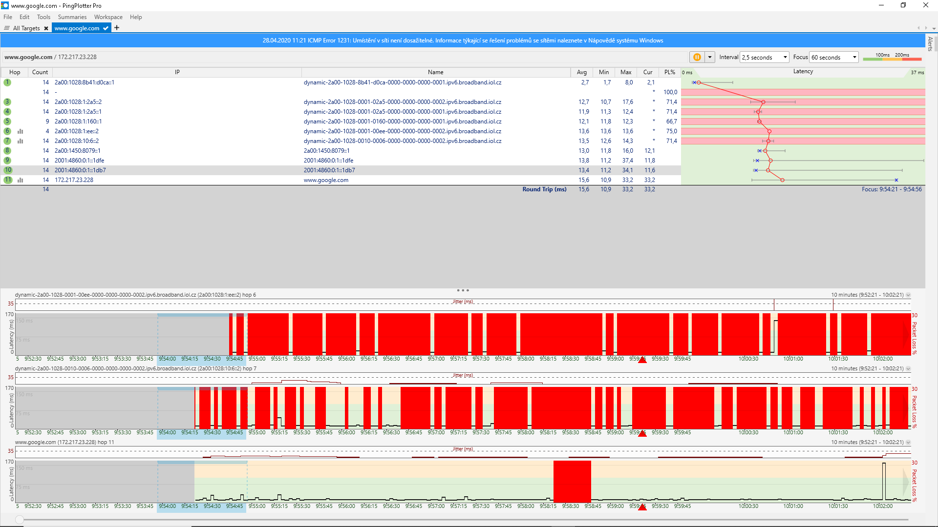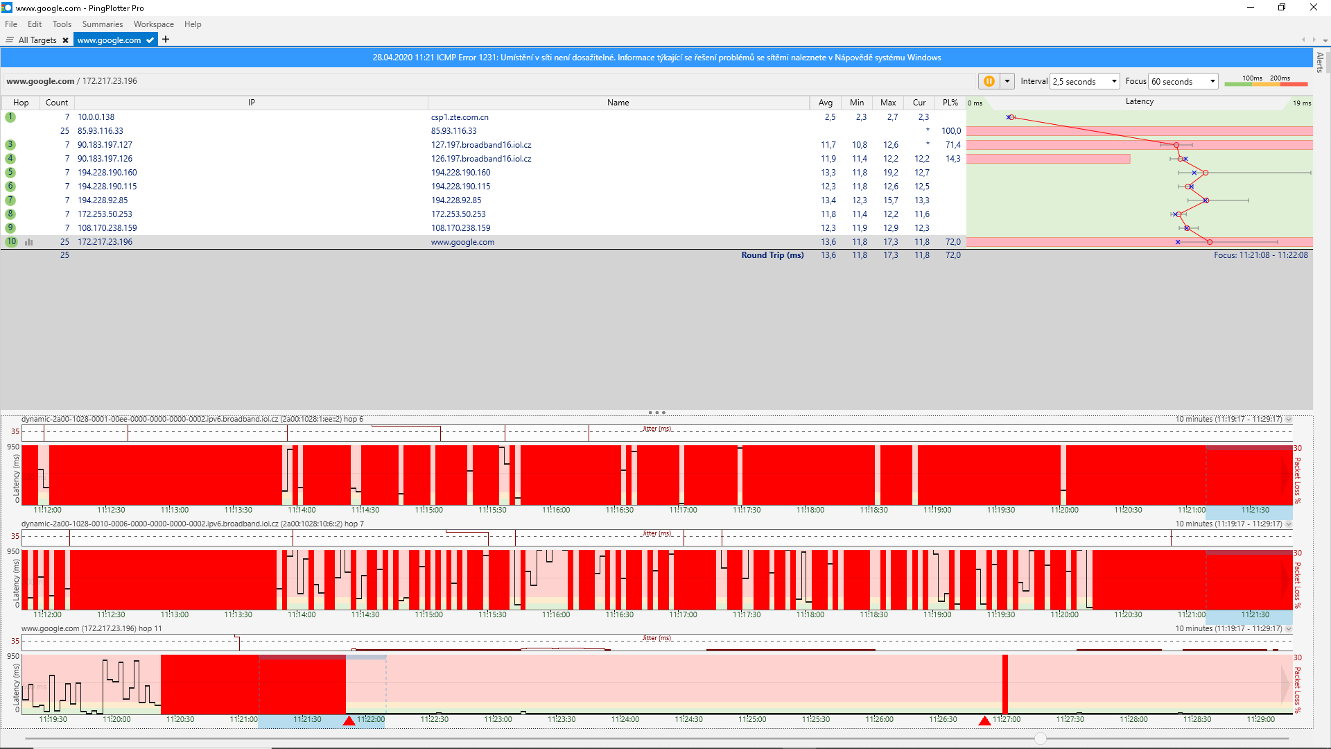K Analýze jsem použil program PingPlotter a vyšli zajímavé věci, které neumím vyhodnotit. :eh: