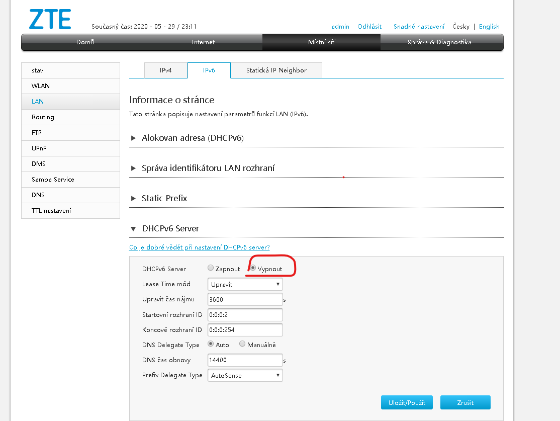 zkusil jsem prolézt modem/router od O2, kde by mohlo být nastavení IP6 a pokus omyl