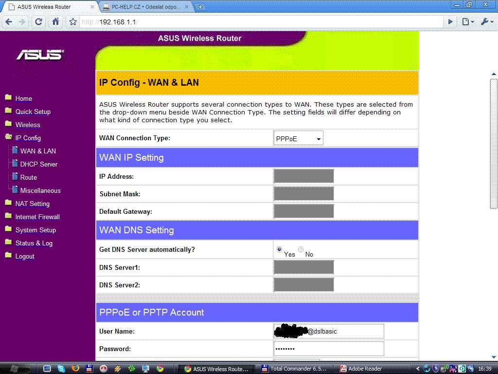 Skušal si postupovať tak ako som ti opisoval v predchádzajúcom príspevku? Nemám momentálne k dispozícií tak dlhý kábel aby som pripojil modem priamo k Pc a pozrel sa čo som tam presne zmenil, ale ako pozerám do svojich poznámok ktoré som si narýchlo zapisoval keď som to ladil s tým technikom, tak v nich mám uvedené, zmeň PPPoE na BRIDGE . A ešte v nastaveniach routra mám v položke IP Config - WAN & LAN nastavené WAN Connection Type: na PPPoE a v PPPoE or PPTP Account mám zadané prihlasovacie údaje ktoré som dostal od poskytovateľa netu. pozri screen
