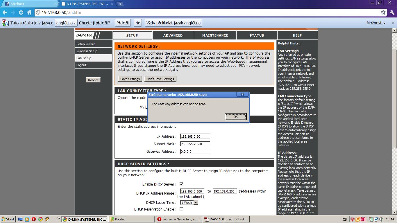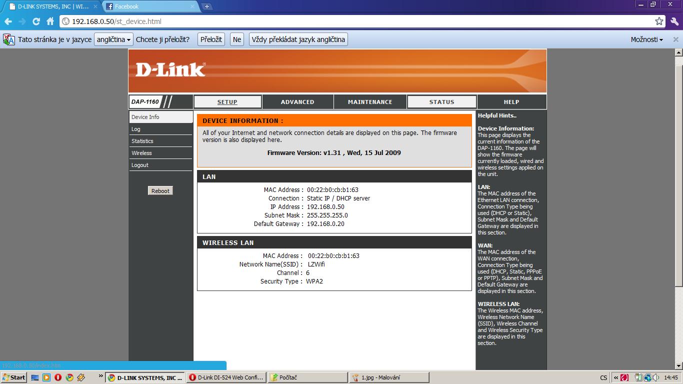 Ahoj mám router D-link DAP - 1160, a nemůžu, nebo spíš nedaří se mi to nastavit, mám tady nějakej papír od chlápka co nám tam nastavoval a je tam SSID: LZWifi