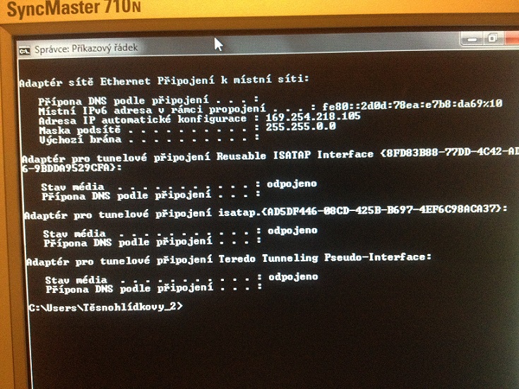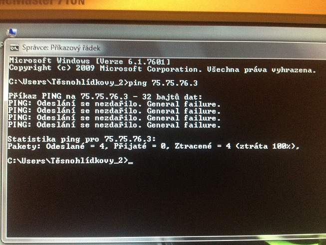 Příkaz ipconfig na IP adresy, ping 77.75.76.3 pro ověření nefunkčnosti