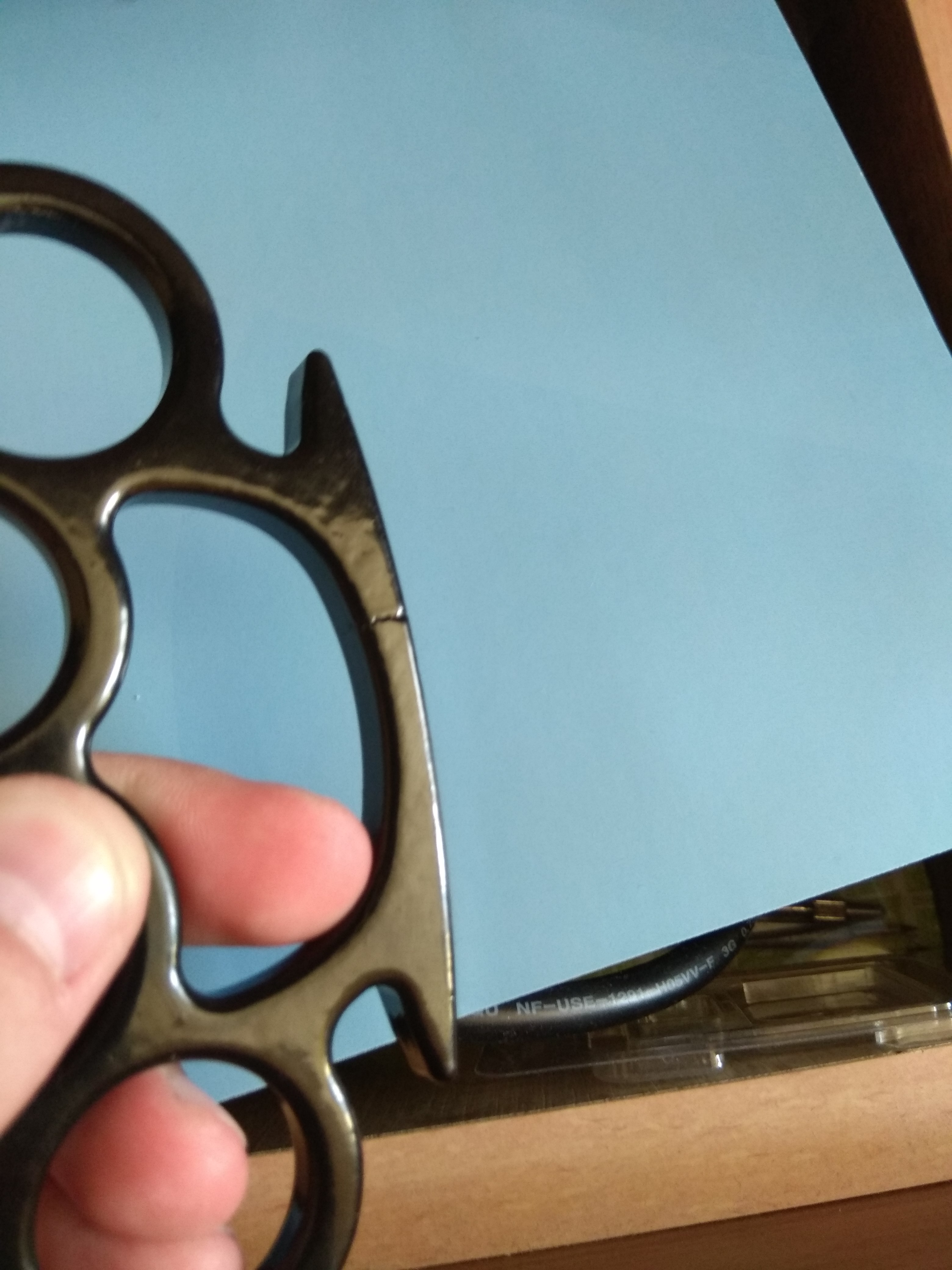 Osobně bych takovouhle "vadu", která nemá vliv na funkcni, což je mlácení do lidí, vůbec neřešil. Když to budeš pár let nosit v kapse, odrbeš povrch tak, že z té barvy nezůstane nic. A z hran a výstupků dost málo, už od pohledu to není moc extra materiál..