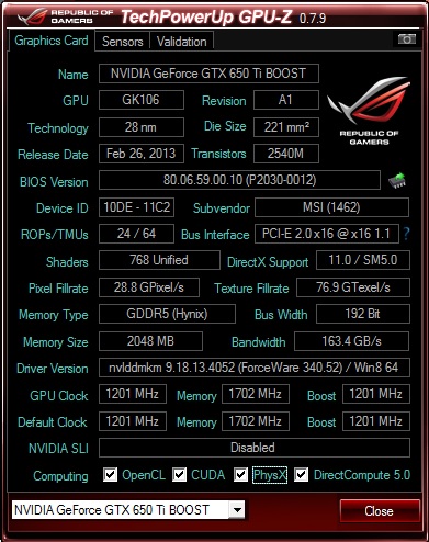 Nicméně sem zvedl frekvenci jádra z 1006Mhz na 1201Mhz a frekvenci pamětí z 3004Mhz na 3406MHz (na těchto frekvencích jsem si nejprve ověřil stabilitu přes AfterBurner a potom zátěž v benchmarku i v gamingu)