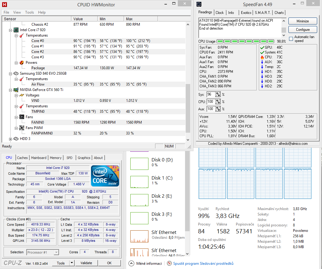 Speedfan není stále plně kompatibilní s Windows 8 a problém přináší bug v Intel RST a měl bys ho spouštět s parametrem /noscsiscan. Ale z toho si nic nedělej, protože i kdybys byl jeden ze šťastných majitelů Corsair H100, kterým nesedí styčná plocha na CPU, stále nemohu najít slov při pohledu na "OC" vlastního procesoru. Pro objasnění dostačuje nahlédnout do nějaké galerie či výsledků OC i7-920 +/- 4GHz a příčinu chování uvidíš sám. Nebudu Ti bránit ve stažení a instalaci dalšího skvělého software a ani vysvětlovat, proč. Nic se tím nezmění.