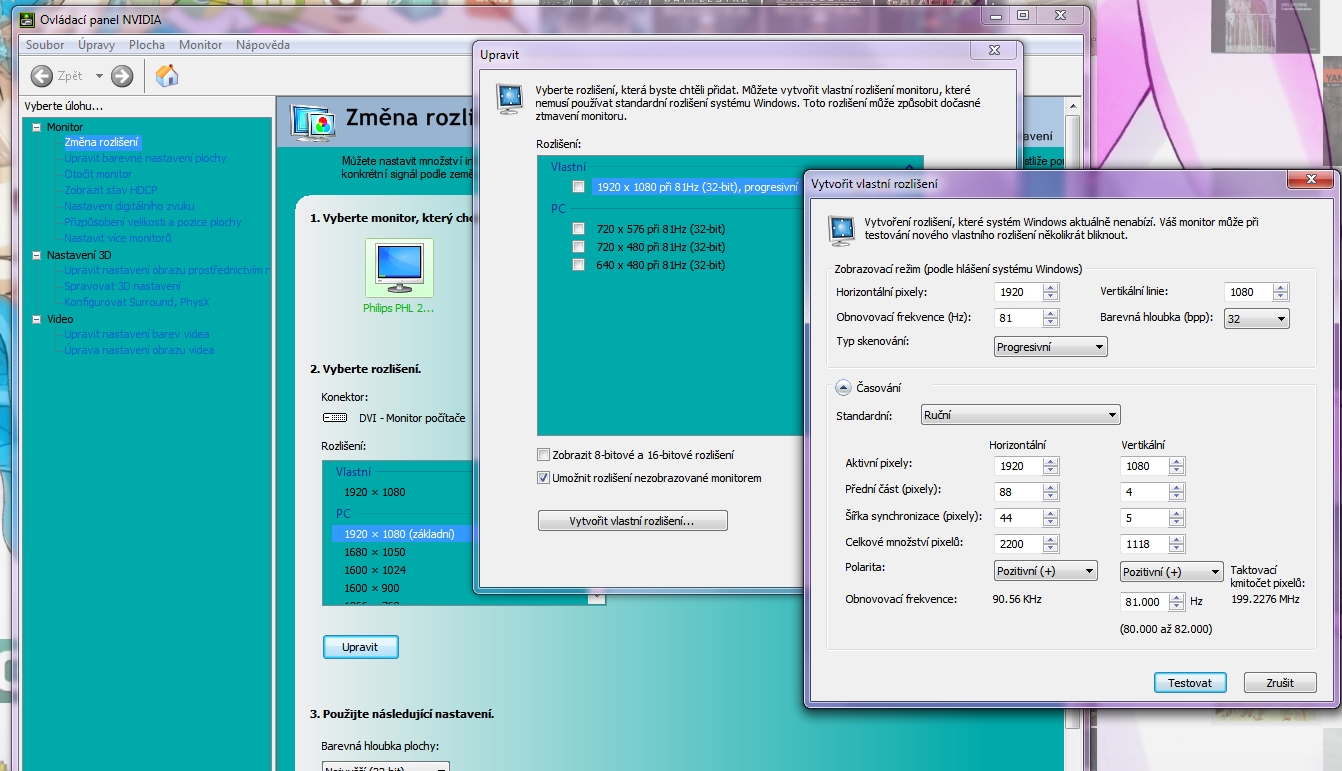 Tady máš moje nastavení, jestli to nepojede tak to bude chtít kabel dual DVI který zvládá 330Mhz. Stačí kliknout na upravit a pak vytvořit vlastní nastavení. Když bude něco špatně, tak zmáčkni ESC nebo klávesu N, jednou jsem musel provést i hard reset.