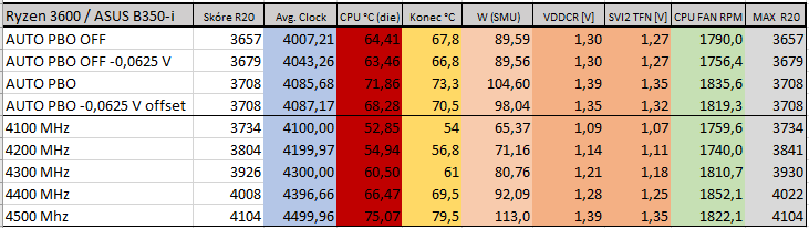 Cca stejné výchozí podmínky všech testů, sledována přesně doba R20 benchmarku (+/- pár vteřin max), logováno přes HWinfo. Všechna manuální nastavení voltáže přes offset, při AUTO je vše default krom manuáního vypnutí a zapnutí PBO +200, a opakováno s -0,0625 offset VDDCR (při testech se tato nastavení chovalo v R20 nejlépe). Na konec tabulky jsem dal ještě případná maximální skóre v R20 na stejné nastavení mimo toto testování. U 4100MHz byly volty jen bezpečný nástřel, zvládlo by to stabilně asi i míň. Uff, tož asi tak.