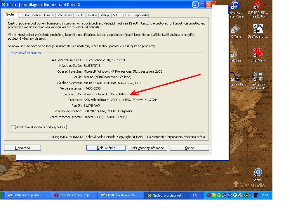 Do Start - Spustit - napiš dxdiag a potvrď. Pak si opiš verzi Biosu viz screen.