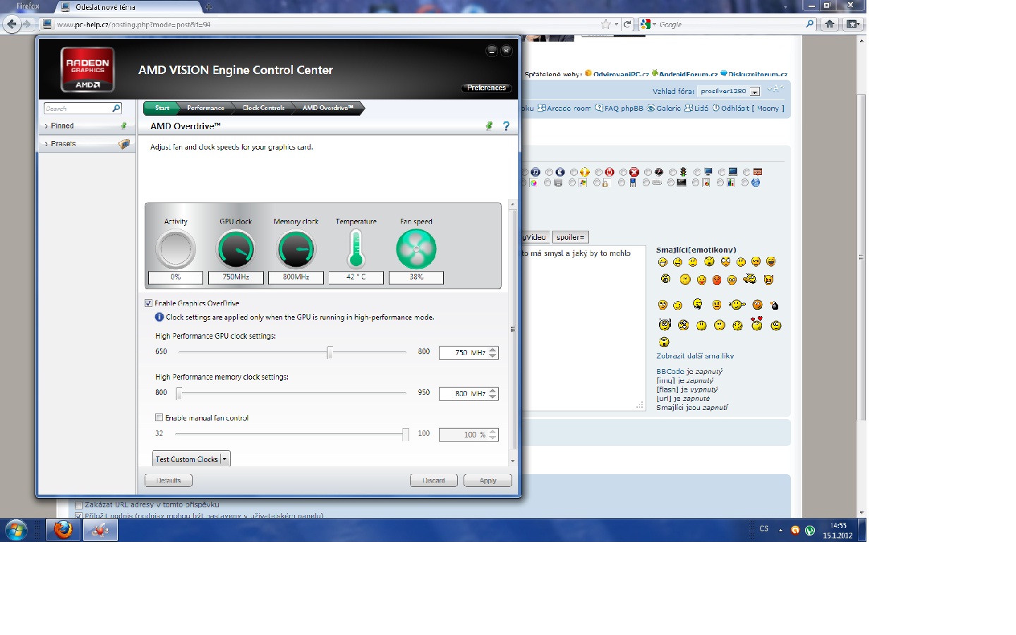 Výchozí hodnoty: GPU: 750 MHz, Memory: 800 MHZ. Během taktování mi jela grafika i na 99 % výkonu a teplota stoupla nanejvýš na 62 °C