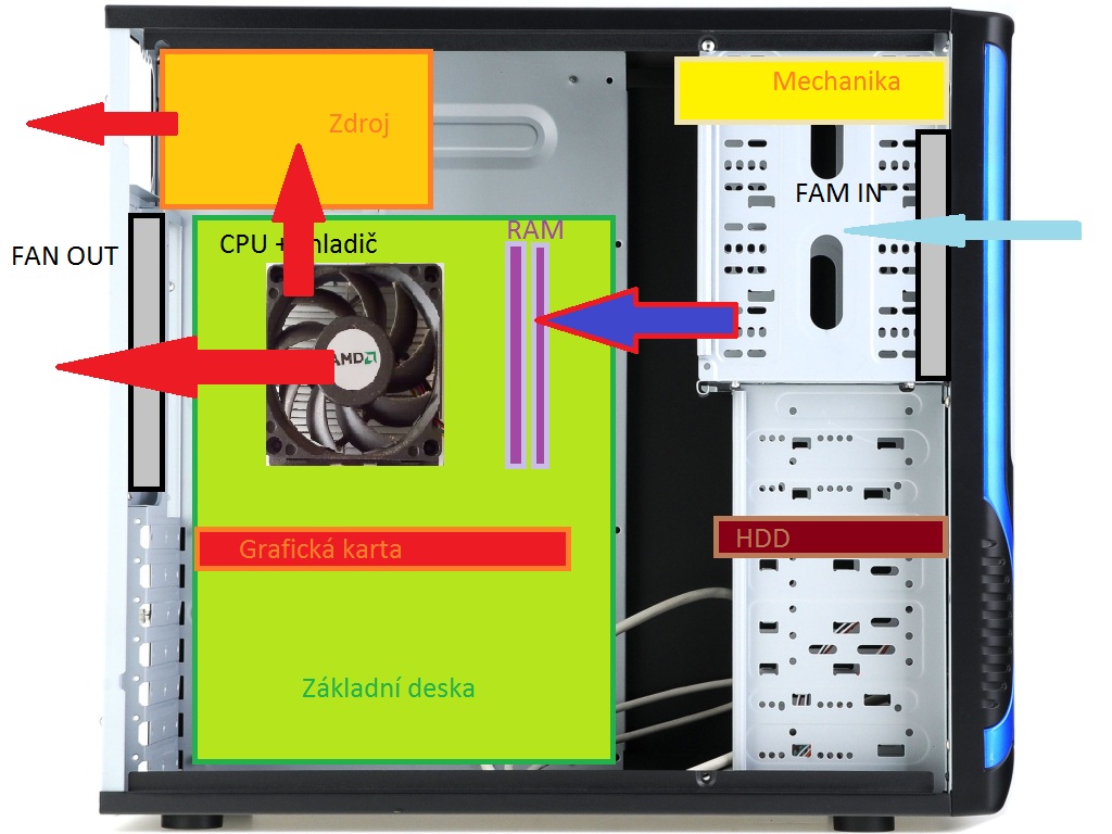 Přemejšlel sem o přidání ventilátoru na přední stranu pod mechaniku který by sal vzduch s místnosti FAN IN a do zadu který by vyfukoval ze skříně FAN OUT, nevím jestli ale bude stačit 92mm ventilátor protože 120mm mi přijde moc veliký a nevzhledný + přidat prachovej filtr ten se dává před ventilátor myslím (je to tak ?) FAN IN měl jsem namysli něco takového dopředu http://www.suntech.cz/produkt/77373-air ... s92-deluxe + http://www.alza.cz/prachovy-filtr-akasa-fan-d60648.htm a do zadu http://www.suntech.cz/produkt/138681-ex ... -6dba-3pin ale na obrátku je vidět i 4pin ale je napsanej jen 3pin chtěl bych to zapojit to tiš na zdroj nebo použít tohle jestli tam není ten 4pin http://www.alza.cz/revoltec-redukce-nap ... d77691.htm (myslím na FAN OUT a dal bych ho pod zdroj tam je volný místo na ventilátor myslím že je to 70mm).