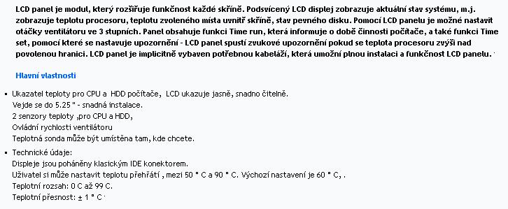 Nevím, zda zrovna tenhle panel umožňuje i regulaci, podívám se na to. Jinak jako monitorovací panel to není špatný, ale co jsem zatím viděl, ukazované teploty jsou hodně závislé na umístění čidel (panel mívá vlastní) a třeba u CPU asi bude problém umístit čidlo tak, aby ukazovalo teplotu alespoň se blížící skutečné. S HDD tohle nemá nic společného. Tady máš něco přímo o tom vyobrazeném panelu: