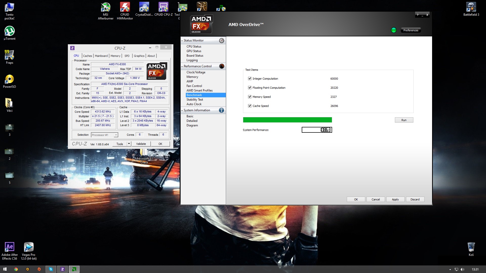 AMD FX-8350@5GHz stabilní, Asus Crosshair V Formula-Z, 2x 4GB 2400MHz TridentX, AMD Radeon HD6870, SSD Kingston HyperX 256GB, cca 2TB pevné disky, Corsair TX850W. Další HW: AMD x4 955 BE, 965 BE, 970 BE, 975 BE, 980 BE, 1090T BE, 1100T BE, FX-4300, FX-6300, FX-8320, FX-8350, FX-9370 atd