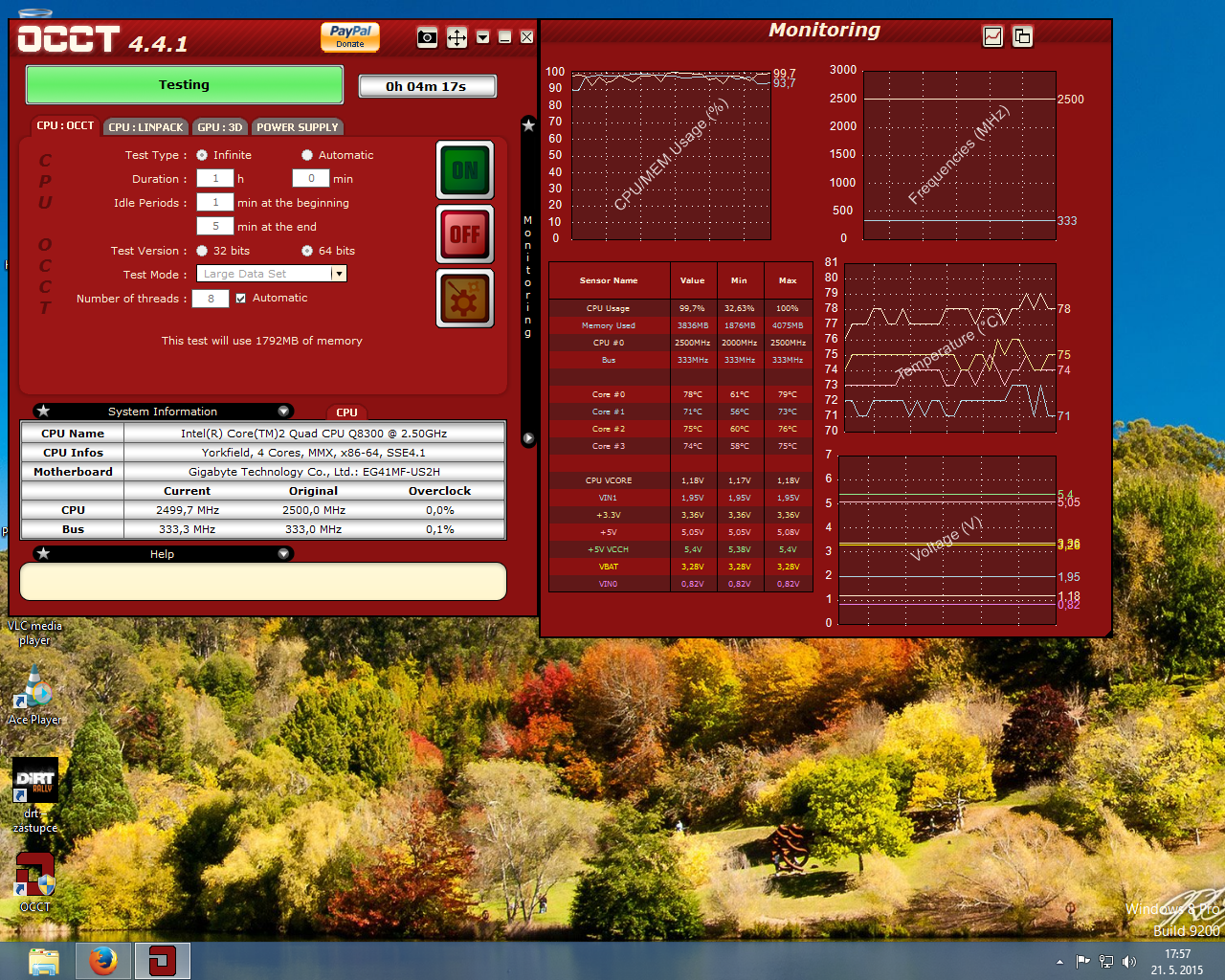 Teploty jsou tak na hraně, výše bych to nehnal (teď jsi na nějakých 80°C) takže můžeš jemně zkusit pohnout s FSB, bez zvedání Vcore by se dalo někam dostat, ale neřekl bych, že se se současným chlazením dostaneš moc vysoko...