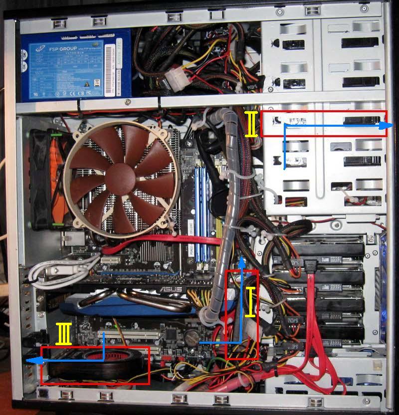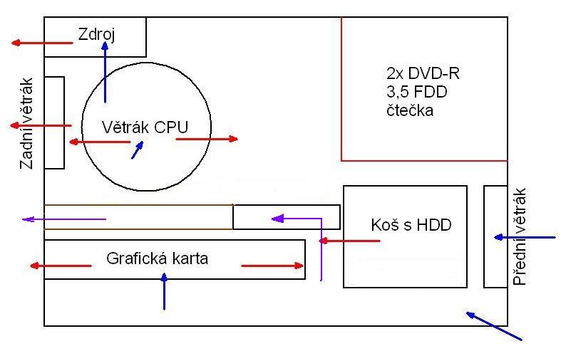 Vzadu za HDD ho odsaje přidaný ventilátor (1) a pošle ho nahoru. Tak současně přisaje horký vzduch z grafiky. Výše se srazí s vlahým vzduchem od procesoru a postrčí ho k dalšímu přidanému ventilátoru (2), jenž ho vyžene ven čelním panelem. Vzhledem k tomu, že se tvoří pod grafikou oblast bez pohybu vzduchu, přidal jsem tam třetí ventilátor (3), jenž zde nasává vzduch a vyfukuje ho zadní záslepkou. Druhá polovina grafiky horký vzduch vyfukuje přímo vzadu ven. Druhá půlka vzduchu od chladiče procesoru je nasáta outake ventilátorem a částečně i zdrojem.