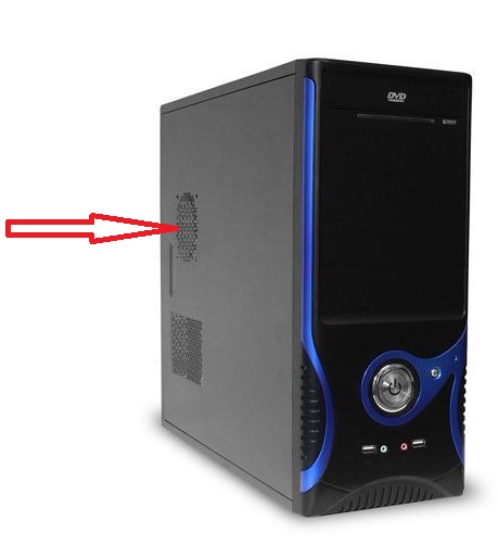 I nejlevnější skříně mají většinou možnost osadit jeden 80mm ventilátor dopředu.Stačí sundat přední čelo skříně a podívat se.Pokud to půjde,tak tam ten 80mm ventilátor nasadíš.Navíc máš možnost osadit ventilátor přímo naproti chladiči procesoru,takže to by mu taky hodně pomohlo.Kup 80mm ventilátor a dej ho aby foukal dovnitř,tak jak jsem nakreslil na obrázku níže.