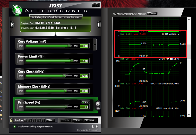 Mám zvedlou voltáž na jádře, každopádně se mi zdá, že je to nějak málo... Kdysi jsem se ptal jednoho z členů z fóra, který má s tímto zkušenosti a ten mi napsal, že 1,27-1,3 by mělo stačit na 1200Mhz... Každopádně já mám jádro na 1265Mhz a problémy jsem nezaznamenal. Testuji to takto již minimálně měsíc, mimochodem. (Voltáž mám +88, jak můžete vidět na obrázku. Je to dementní, že nevidím přesnou hodnotu...)