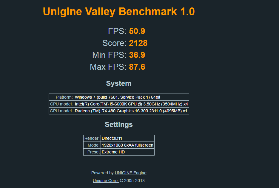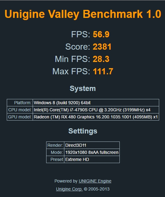Pozn: AMD karty mají od nějaké doby nižší skóre v Unigine Valley. Moje předchozí R9 290 měla 2090 bodů se stejným ovladačem.