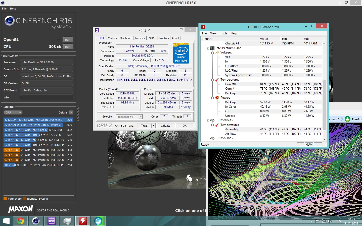 Intel G3258 @ 4,3 GHz. Původní napětí, pouze jsem zvýšil násobič 8) Základní deska je ASUS H81M-PLUS, BOX chladič, Arctic MX-2