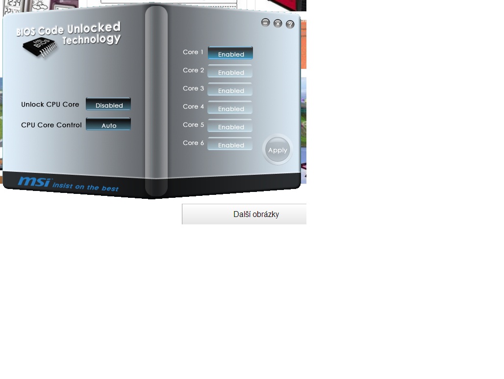 Myslím si že by pomohlo aktualizace Bios, mám v 02.61.. Tak jsem si stáhl LiveUpdate od MSI a ten mi rovnou našel Utilitku BIOS Code Unlocked Technology.. Spustím jí, dám Unlock CPU COre do Unabled, CPU Core Control do Auto a dám APPLY.. PC se restartuje, vypne, ale už nenaběhne.. Při zapnutí pěkně naskočí, vše se "roztočí", hučí, ale obraz nikde a ani žádna odezva..