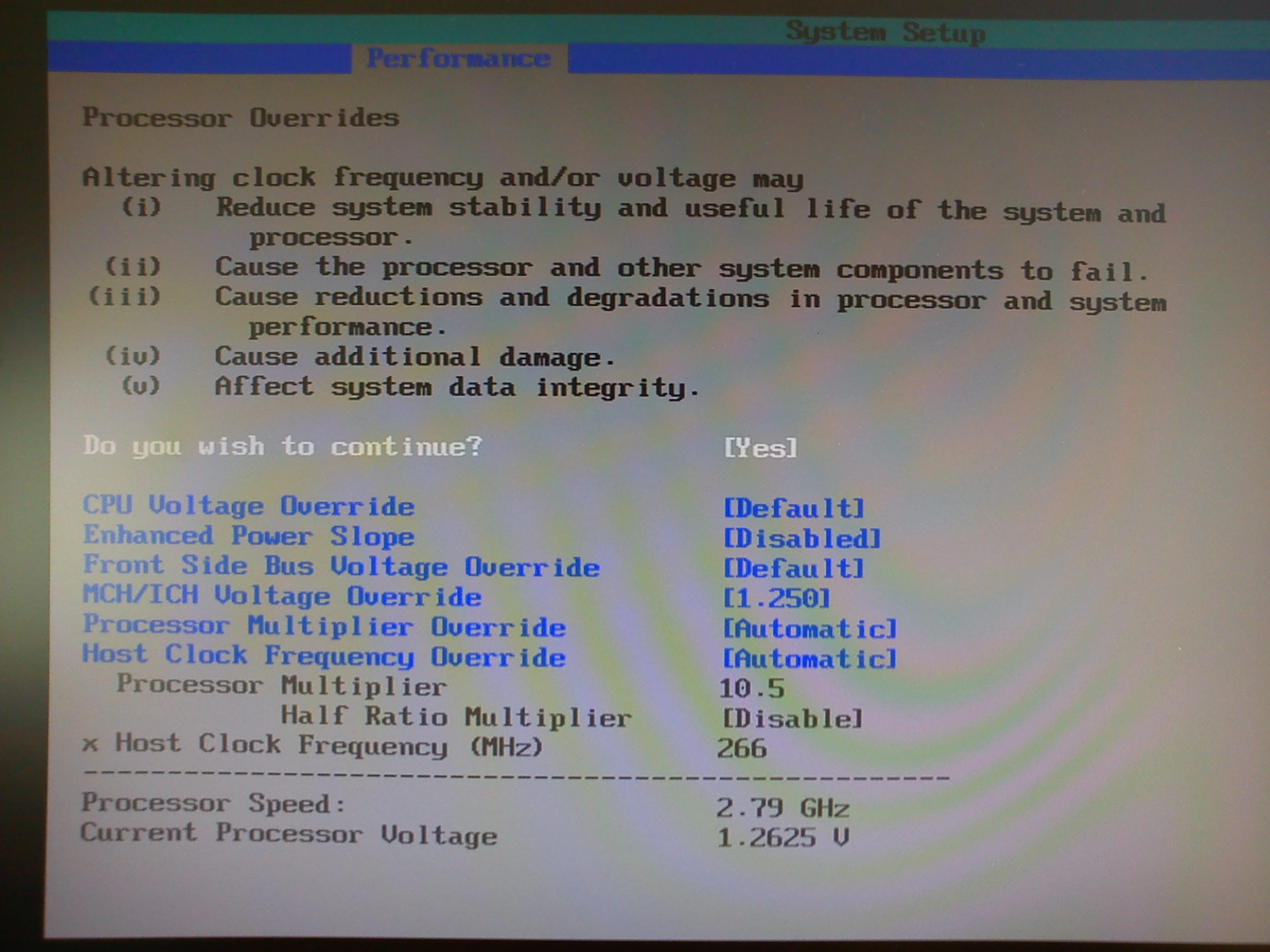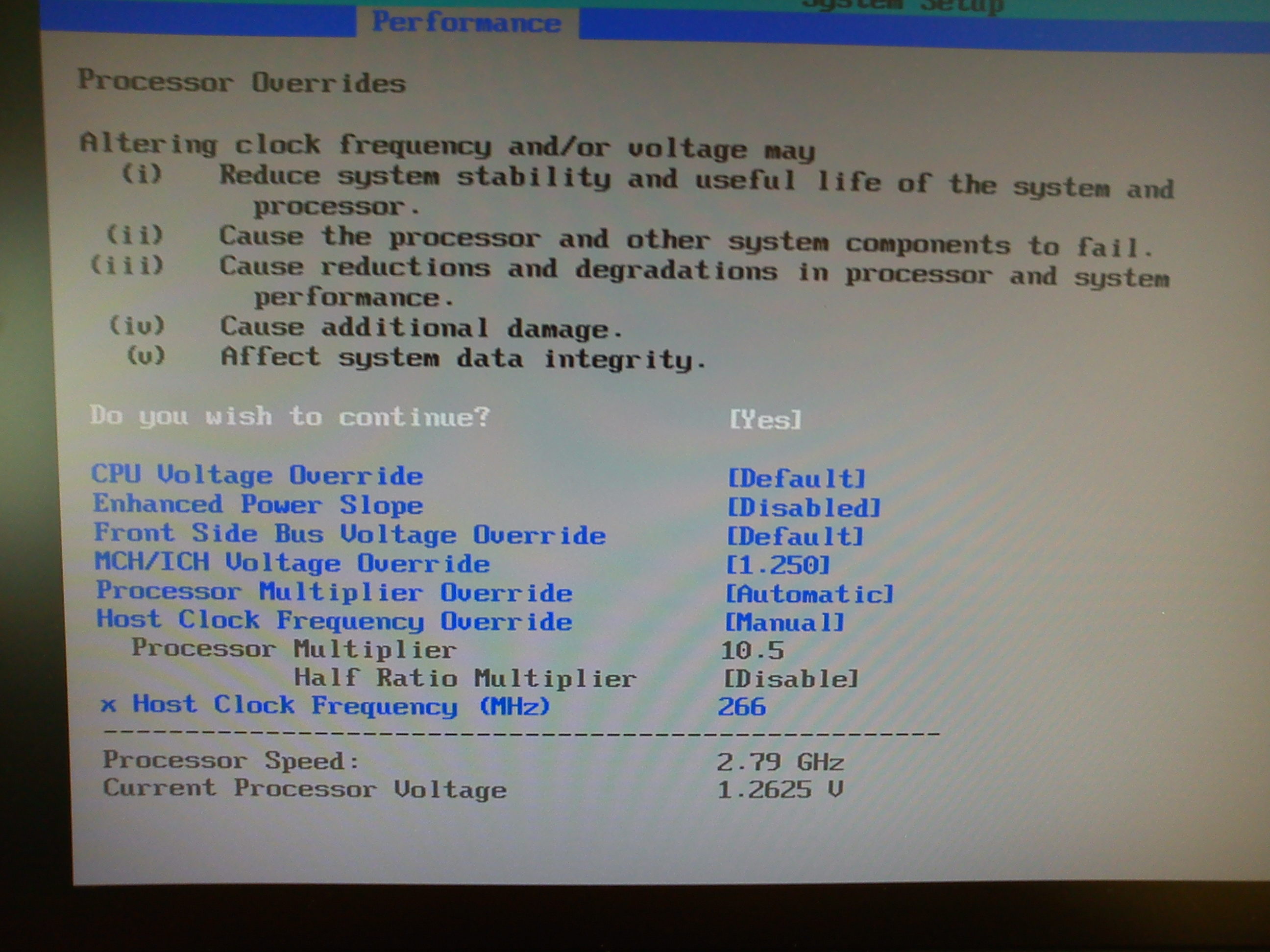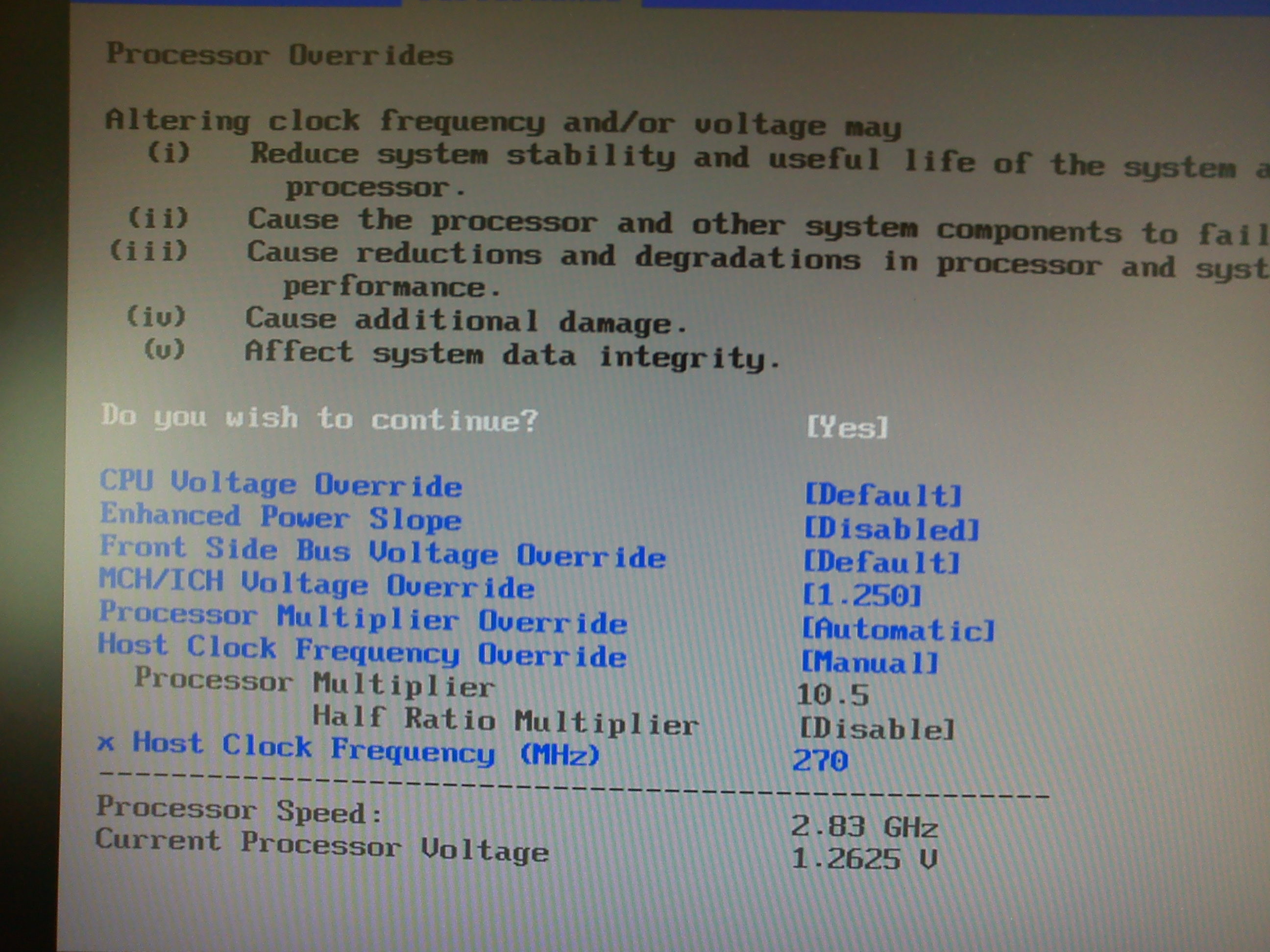 A teď k tomu jak to dopadlo... Zvedl jsem základní takt z 266MHz na 270MHz - prakticky jen pro to, abych nejprv zjistil, co to udělá s RAMkama a sběrnicí FSB. Vypl jsem v biosu tu úspornou funkci (EIST), prý mají intely ještě C1E, ale tu jsem tam nenašel. Každopádně, PC naběhl, chvilku pokračoval v běhu, ale zdálo se mi, že pomaleji, než s 266MHz. Po cca dvou minutách jsem přišel o obraz -> tvrdý reset, změna základního taktu zpět na původní a znovuzapnutí EIST. Dneska jsem měl víc času, takže jsem "taktování" opakoval, zda-li se nejednalo pouze o náhodu. Opět jsem přišel o obraz a pokusil se restartovat PC. Obrazu jsem se už ale znovu nedočkal, ani standartního "pípnutí" při startu. Pomohl až restart biosu přemostěním na Clear CMOS. Před druhým pokusem jsem nafotil bios, jeho hodnoty ve chvíli, kdy je v "továrku", pak hodnoty kdy akorát zapnu možnost manuální změny základního taktu - který ale neměním (kupodivu se lišila hodnota sběrnice) a pak hodnoty ve chvíli, kdy je základní takt nastaven na 270MHz.