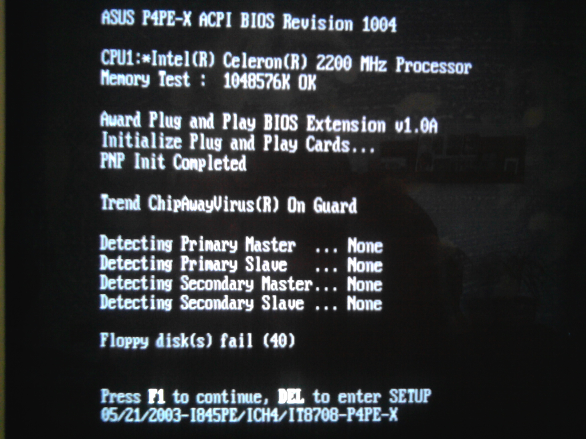 System te informuje, ze nenasel disketovou mechaniku - F1 to 'opravi', jinak zkontroluj jeji nastaveni v BIOSu. Horsi ale je, ze nedetekuje zadne IDE zarizeni.