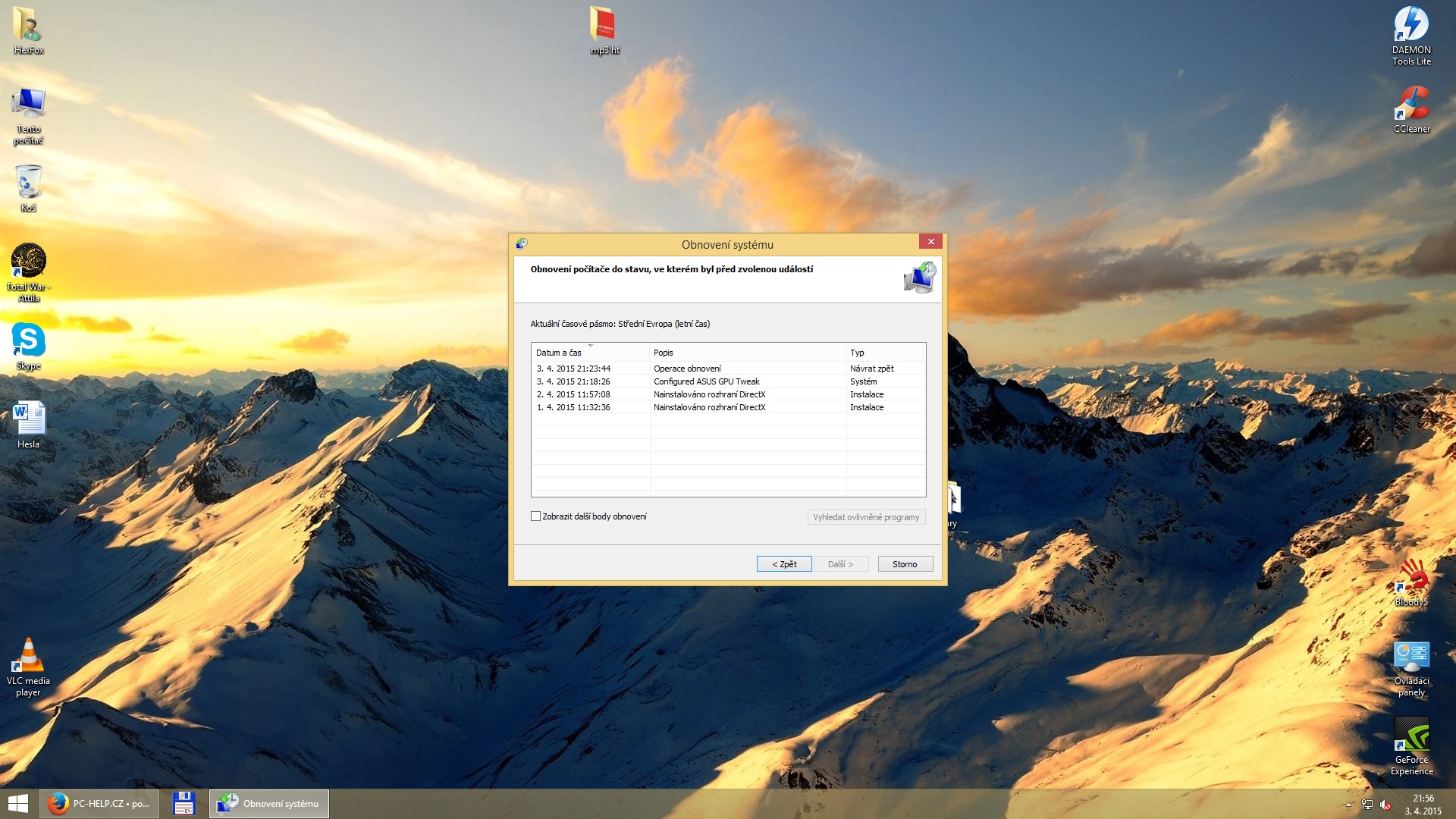 Takže 50% opraveno .. Odinstaloval jsem všechno z dneška ohledně taktování .. PC prošel antivirem pro jistotu ... nakonec pomohl bod obnovení z 2.4 instalace direct X ... na lolku jsem zpátky, ale objevil jsem tento zajímavý Bod obnovy, takže jestli se nepletu jde, program Asus GPU Tweak změnil nastavení systému někde kam jsem se nemohl dostat nebo nenašel a nastavil na méně nárokové hry menší výkon/W ... ? Ale i tak bych měl rád GPU nataktovanou alepsoň trochu s tím, že mi Lolko + WT půjde .. neví někdo co bych pro to mohl udělat ? :)