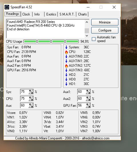Těch 128*C budu doufat, ze je chyba softwaru nebo čidla. CPU chladič je upevněny ? Pasta je pod nim ? Tenhle problém je "nový" nebo od sestavení PC apod ?