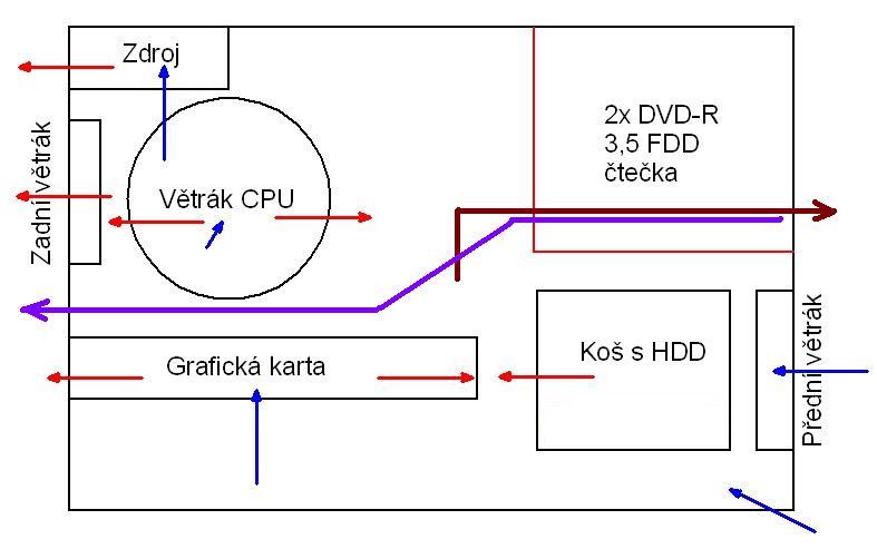 Vzhledem k nepříliš dobré airflow v mé skříni se mě tvoři vzduchový pytel, jenž mě zahřívá HDD na cca 35-50st. Proto bych potřeboval poradit nějaký tišší ventilátor tak asi do 350Kč. Nejteplejší vzduch jde z grafické karty. Při zátěži je docela horký. Od procesoru jde jen vlažný.
