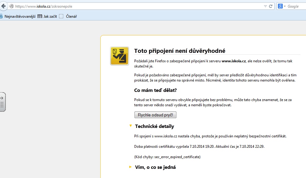 Při přístupu na stránku internetové žk jedné školy (viz screen), která běží na iskola.cz mi to ukazuje "nedůvěryhodné připojení". Co to znamená? Díky.