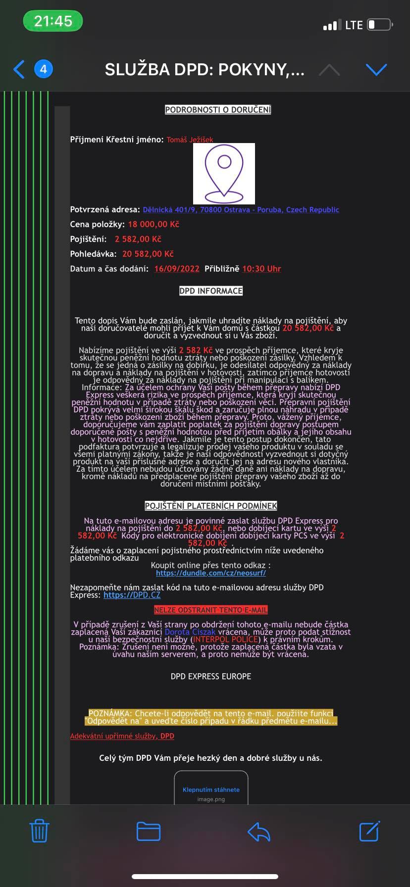 Falešné stránky DPD. K obdržení peněz NIKDY nepotřebujete zadávat údaje k vlastní kartě! Odesilatel logicky potřebuje pouze číslo účtu.