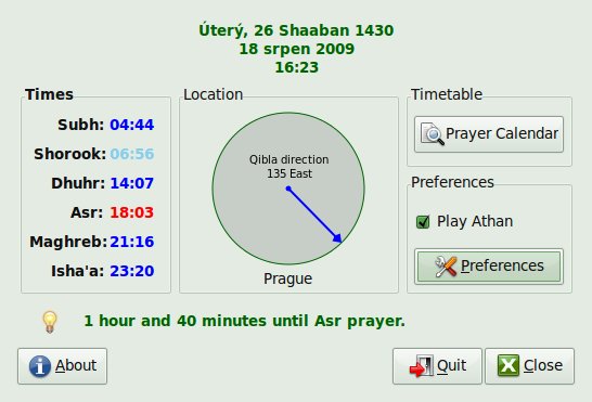 Prayer Times. Navolil jsem Prahu, šipka ukazuje směrem k Mekce. Vlevo jsou doporučené časy modliteb.