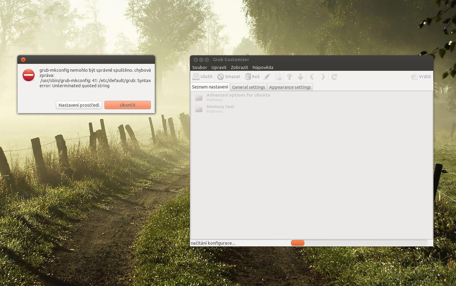 Mám verzi 12.10. Chyba byla opět na mojí straně, nepotvrzoval jsem enterem po napsání add-apt-repository ppa:danielrichter2007/grub-customizer, už to je nainstalované, ale zase mám jiný problém, grub customizer nejde spustit, když kliknu na ikonu, chce to po mě heslo, to napíšu, ale pak se vůbec nic nestane. Zkoušel jsem to spouštět i příkazem s tímto výsledkem v terminálu: *** initializing (w/o specified bootloader type)…