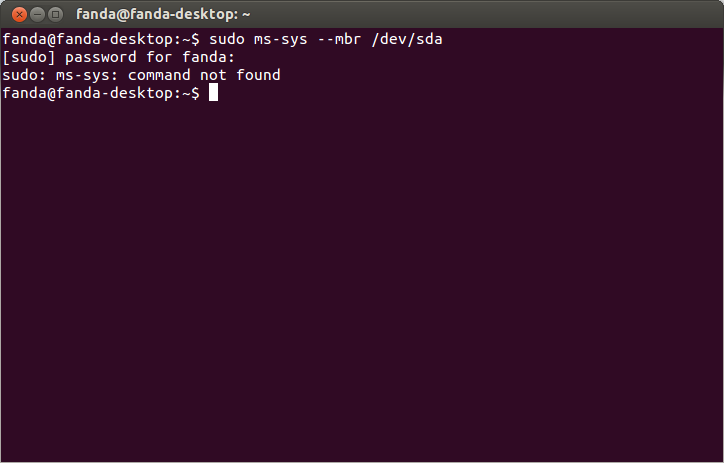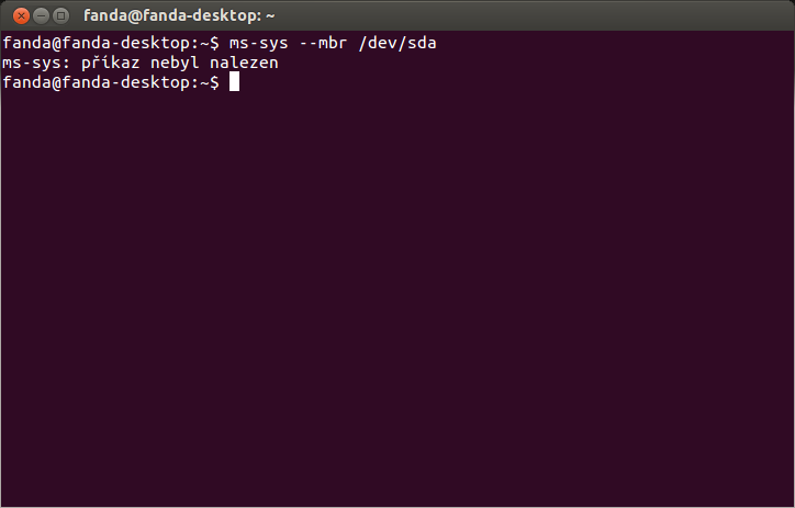 sudo (mezera) ms-sys (mezera) --mbr (mezera) /dev/sda