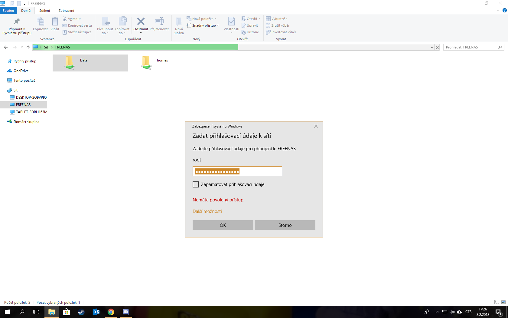 Tady zadávám to heslo a acc a nic. Do nasu jsem to zadal a zadal jsem i uživatelský účet na windows i do nasu a prostě nic.