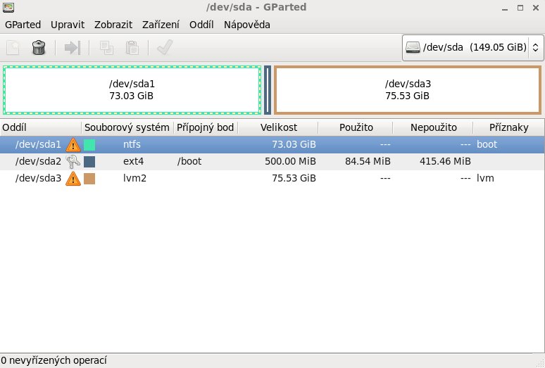 Tady je screen z GParted. Nainstalovaný CentOS, dualboot s W7.