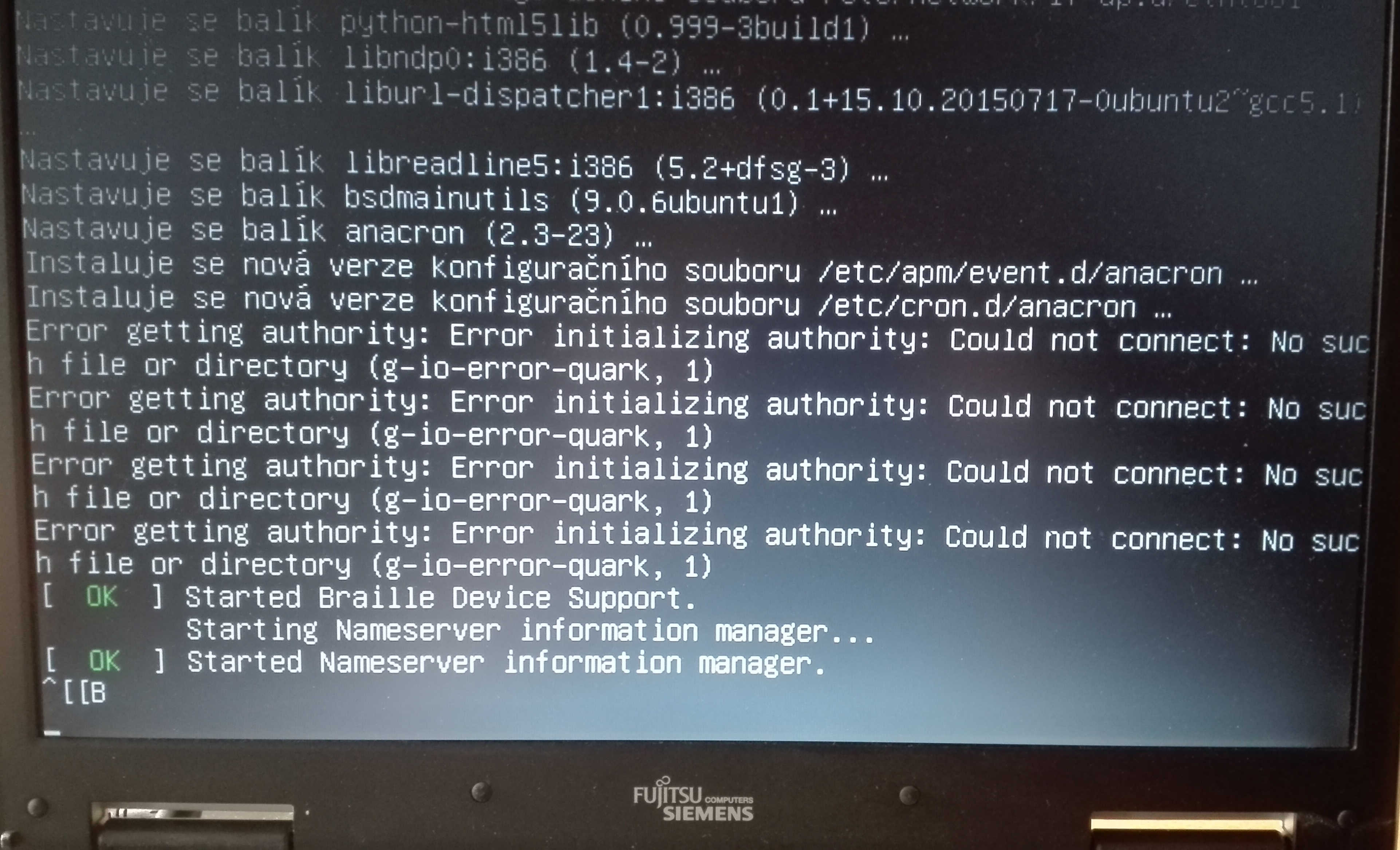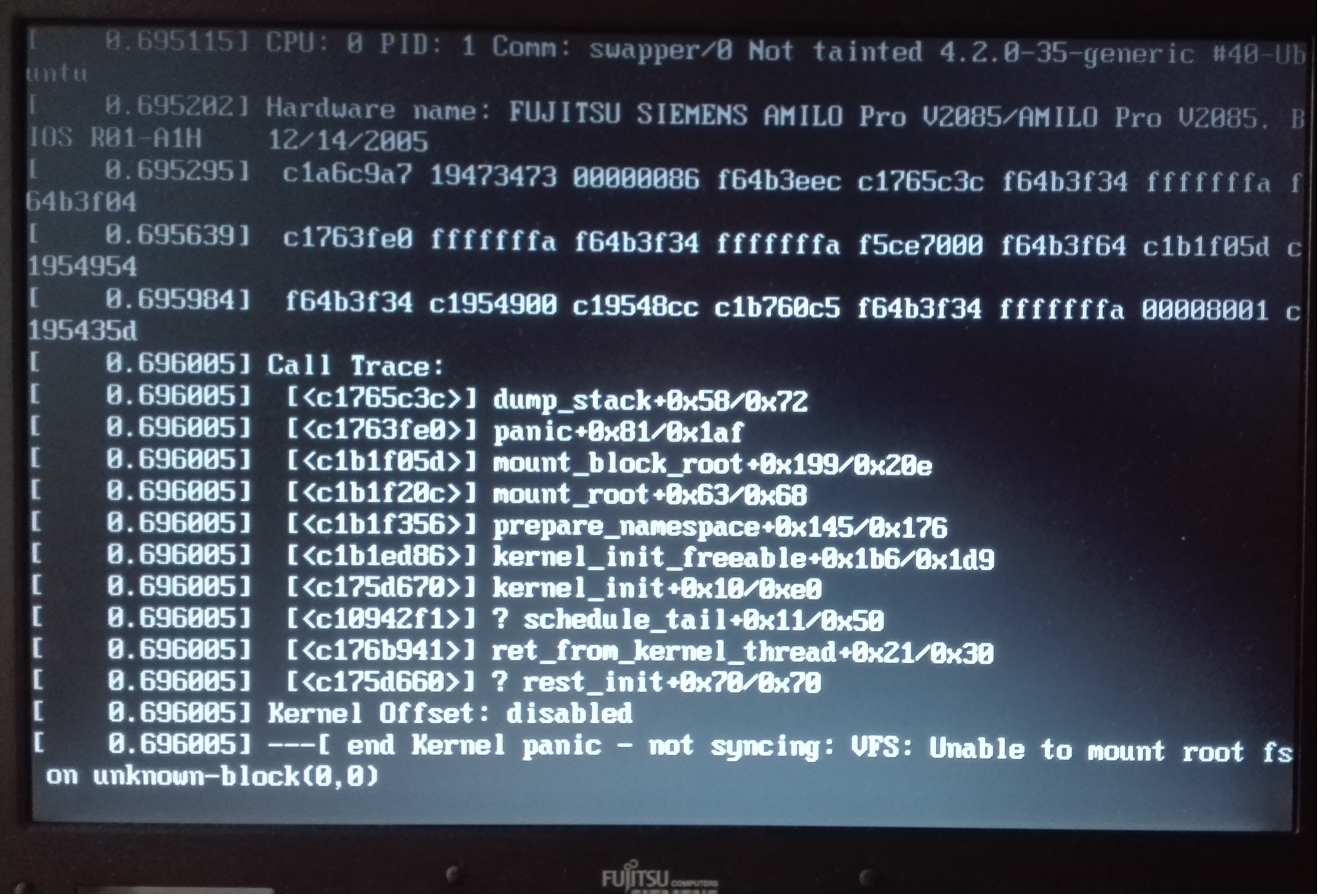 donesl jsme si po delší době starý noťas abych mohl zkusit co funguje na Linuxu. Byl tam Xubuntu 14.04 a po spuštění mi byla nabídnuta verze 15.10, tak jsme dal instalovat. Instalace zdá se probíhala OK, až do doby, než se notebook restartoval, to skončilo následující hláškou a následným vypnutím notebooku: