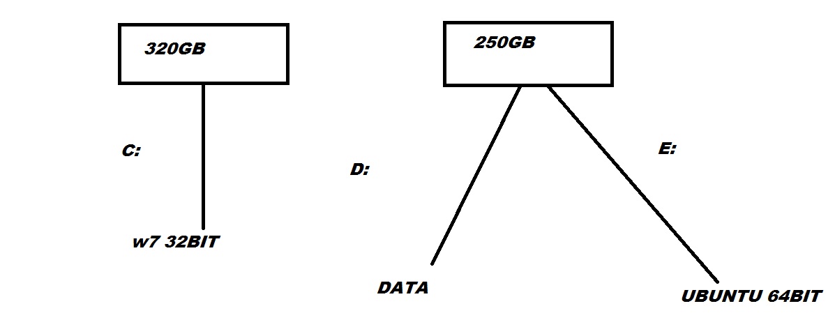 Čau,chci abych měl ubntu na druhém disku dualboot s win7.Neumím vysvětlovat tak jsem nakreslil obrázek.Prostě mám C: 320GB a pak 250GB rozdělené na E: a D: a na éčku chcu ubuntu.viz obrázek.