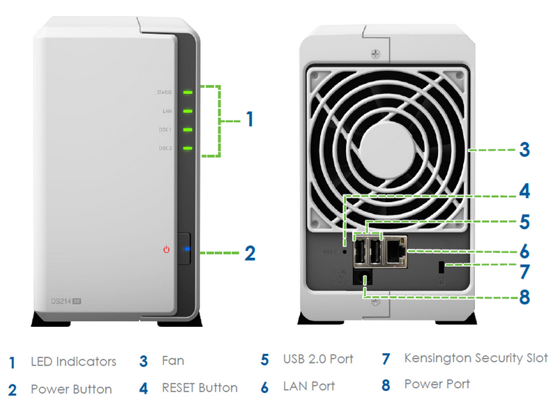Porty USB 2.0 lze využít pro rozšíření kapacity, k čemuž by ale byly příhodnější rychlejší porty USB 3.0 či eSATA. Bohužel tento levnější NAS server žádné externí vysokorychlostní rozhraní nenabízí, takže se uživatelé budou muset spokojit s tradičními porty USB 2.0. Rovněž chybí čelní port a čtečka paměťových karet pro rychlé zkopírování obsahu paměťového média do úložiště. Modely DS214 SE a DS214 Play jsou zkrátka i přes podobný název velmi odlišné.