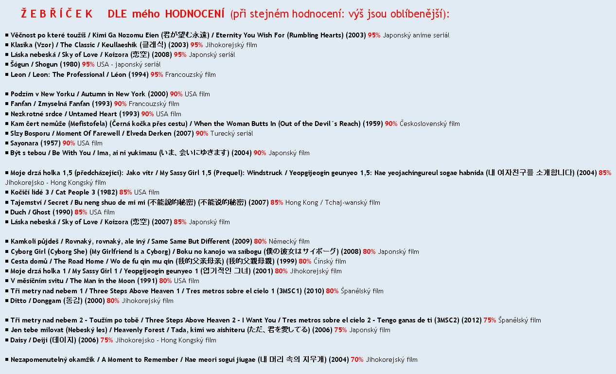 Toto vlákno je poměrně dost navštěvované, aktuálně na 37 příspěvků / 9 579 zhlédnutí. Poslední dobou jsem přidal i nepřímou nápovědu, kde případně sehnat, takže máte možnost zkouknout i poměrně exotické kousky, které v ČR zatím neběželi. Pokud mi pošlete Soukromou Zprávu (tlačítko pod mým nickem) s názvem filmu / seriálu co tu je a který jste viděli, s vaším hodnocením (0 - 100%, vyšší číslo = lepší hodnocení), přidám váš nick s vaším (subjektivním) hodnocením k patřičnému příspěvku, tím usnadníte ostatním rozhodování na co se podívat, pokud se rozhodnou pro "mučení" v žánru romantické drama. Někdy je to i multižánrový mix (zvláště korejský režisér a scénárista Kwak Jae-Yong http://www.csfd.cz/tvurce/16493-jae-young-kwak/ - je tím proslulý + s přídavkem překvapivého konce), také je nutno přihlédnout k místní kultuře a mentalitě, která se často od naší velmi liší.