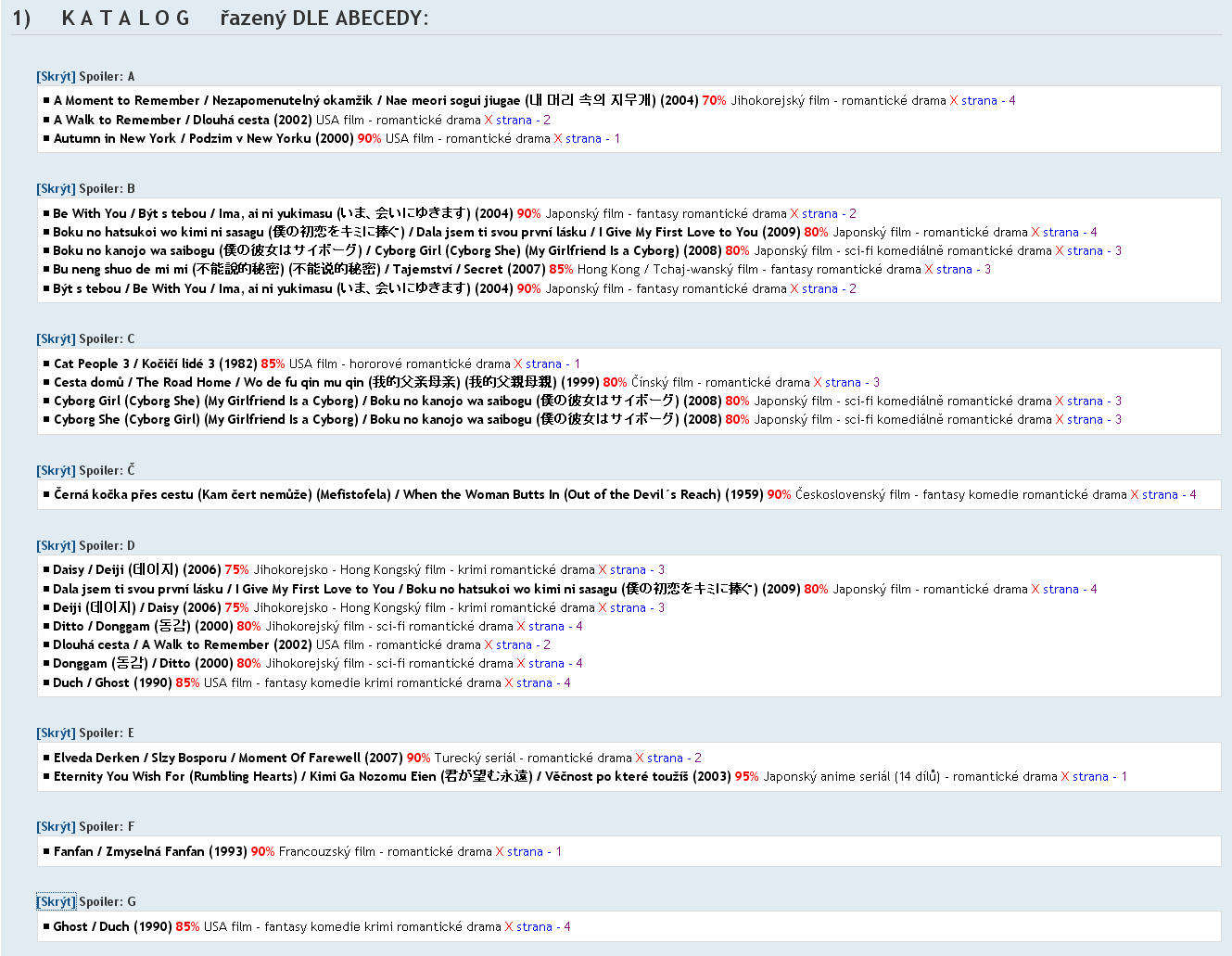 Už před pár dny jsem narazil u prvního příspěvku v tomto vlákně (abecední katalog) na technické omezení fóra, limit v maximálním počtu znaků na jeden příspěvek - 60 000. Byl jsem tedy nucen redukovat v seznamu u pár položek popis. Nyní jsem - protože popsat jednou větou či podobným minimem jednotlivé filmy / seriály v katalogu je krajně obtížné či většinou zhola nemožné - nahradil v katalogu popisky žánry. Na druhou stranu se tím možná katalog i trochu zpřehlednil, většinou vychází na jeden řádek. Až v budoucnu znovu narazím na limit 60 000 znaků na příspěvek, budu nucen katalog roztrhnout na 2 kusy, i když v tomto vlákně to není moc jednoduché, nemám tu žádnou rezervu příspěvků jako v pozdějších vláknech, kde jsem s podobnými potřebami počítal do budoucna ...
