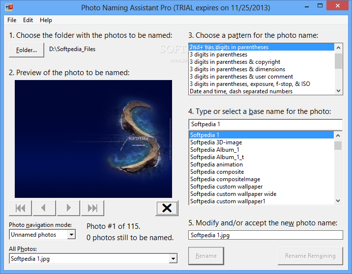 Photo Naming Assistant was designed to quickly give unique, consistent, and meaningful names to digital photo files while minimizing the work on the user’s part. The application is customizable to allow flexibility in building the photo names for individual photos or a whole folder of photos.