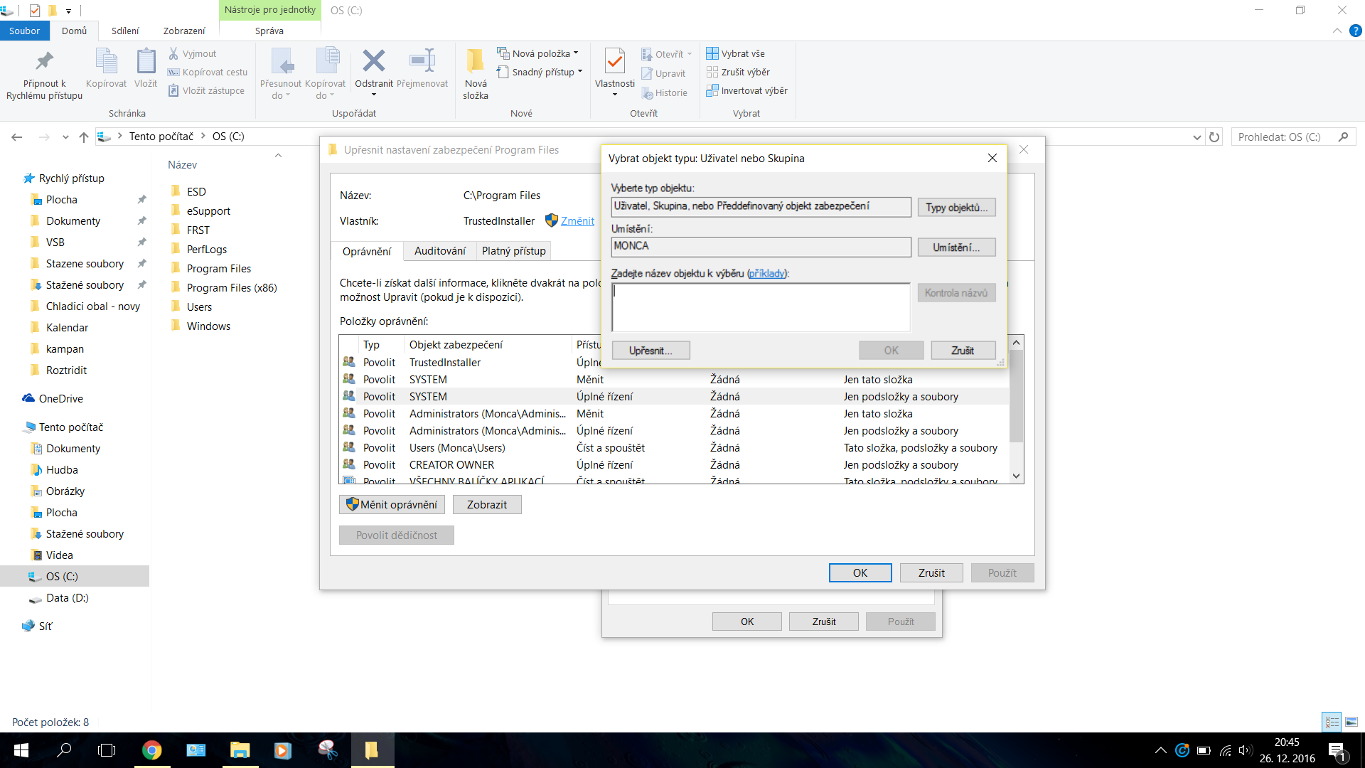 Ahoj jsem zvyklá instalovat všechny programy do složky Program Files. Dnes jsem si chtěla nainstalovat program a nastal problém. Jako administrátor na svém počítači nemám přístup k tomu abych mohla něco měnit v této složce. Dle návodu co jsem našla o změně vlastníka, to mi nešlo.