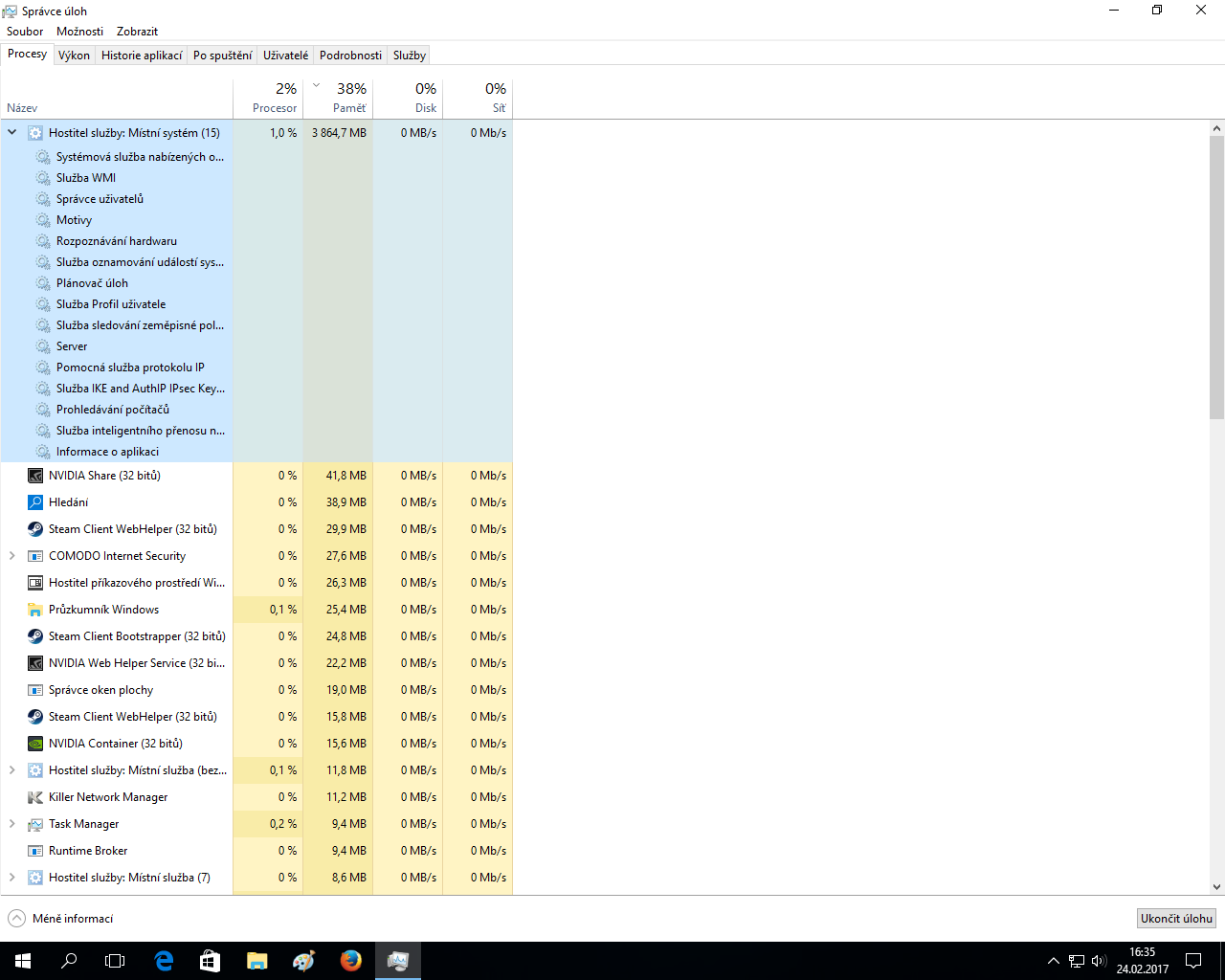Když zapnu PC mam vytížení ram na 10% postupně se navyšuje vytížení ram hostitel místní služby,takže když mam pc zaplé pár dní,tak hostitel místní služby vytěžuje pc na pár desítek procent,takže po pár dnech mam vytížení ram třeba na 40-50%.Asi tak jednou za 14 dní se mi ukazuje blue screen chyba memory management.Jinak mam ram Kingston HyperX Fury Black DDR4 16GB (2x8GB) 2133MHz a desku GIGABYTE Z170-Gaming K3.Takže potřebuju pomoct zjistit co mi tu ram postupně tak hodně užírá?