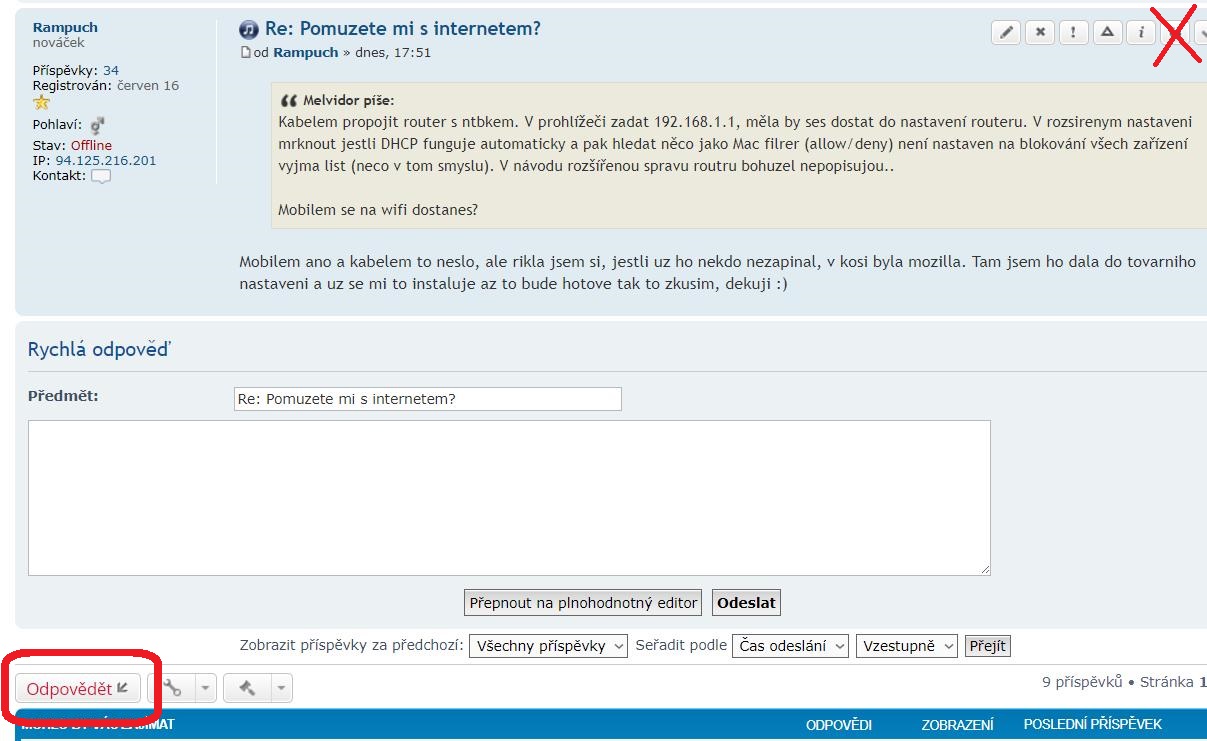 Melvidor píše:Kabelem propojit router s ntbkem. V prohlížeči zadat 192.168.1.1, měla by ses dostat do nastavení routeru. V rozsirenym nastaveni mrknout jestli DHCP funguje automaticky a pak hledat něco jako Mac filrer (allow/deny) není nastaven na blokování všech zařízení vyjma list (neco v tom smyslu). V návodu rozšířenou spravu routru bohuzel nepopisujou..