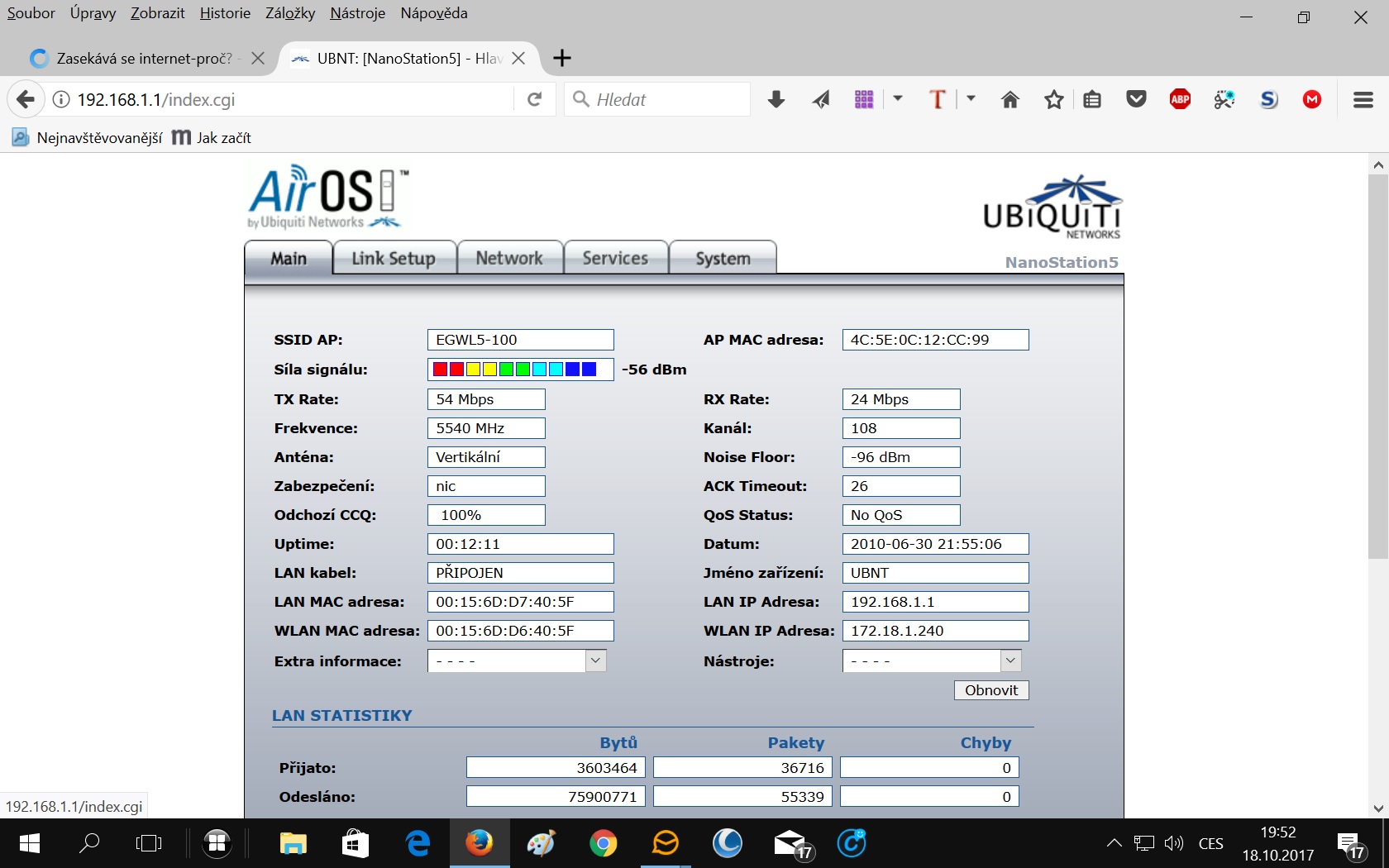 Takže Ubiquiti je zřejmě přijímací anténa wifi někde na střeše. Zároveň v nastavení funguje jako router. Máš tedy dva routery za sebou.