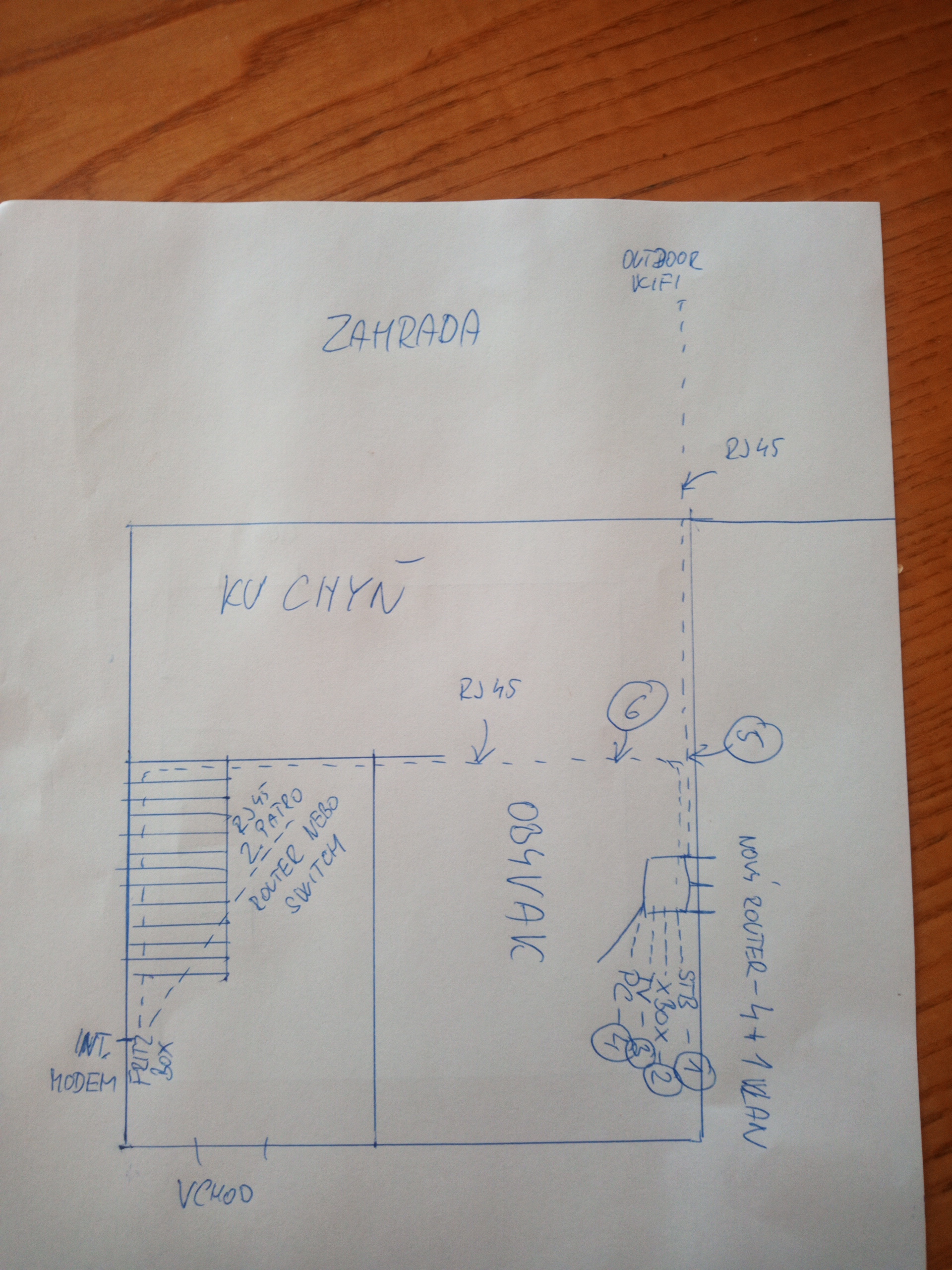 Modem je v chodbe (fritz box 10/100 lan) hrozna wifi. Z neho vede kabel rj45 do obyvaku do routeru , z neho dalsi kabel do druheho patra do routeru nebo switch, z obyvaku vede kabel 20m. ven na zahradu na venkovni wifi . Gigab router v obyvaku ma 4wlan a 1wan, zapojeni mam 5 , takze potrebuji asi switch. Nevim kde ho mam dat a jak to rozvest aby to melo nejaky smysl na pokryti site. Diky za kazdou radu , nejake zaklady mam ,dost o tom ctu ale dobra rada nad zlato