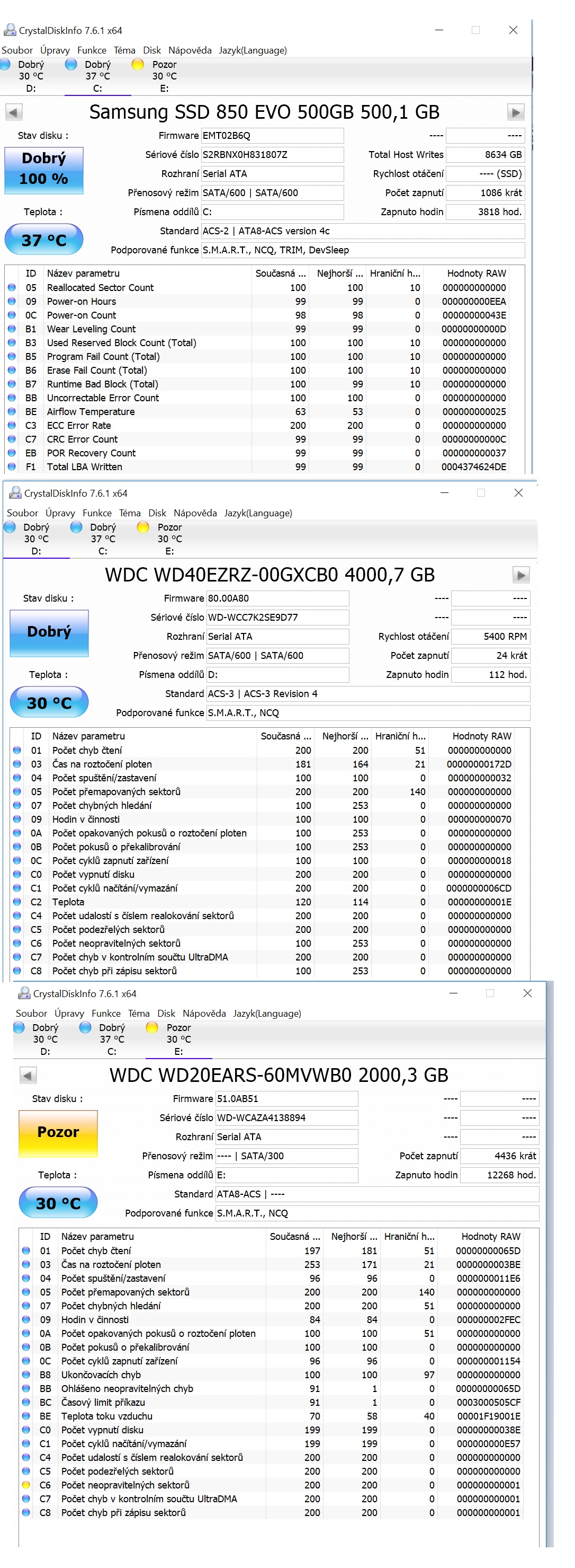 Disk E: toho bude mít vadnýho asi víc, než sektor. Je tam vícero hodnot na sledování, než přemapované sektory. Disky jsou častou příčinou různých záseků, takže když chceš odhalit nějakou závadu, tak musí být připojen jen disk se systémem a ostatní zcela odpojit.